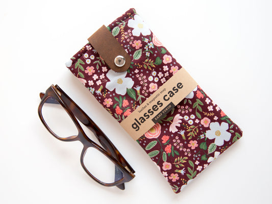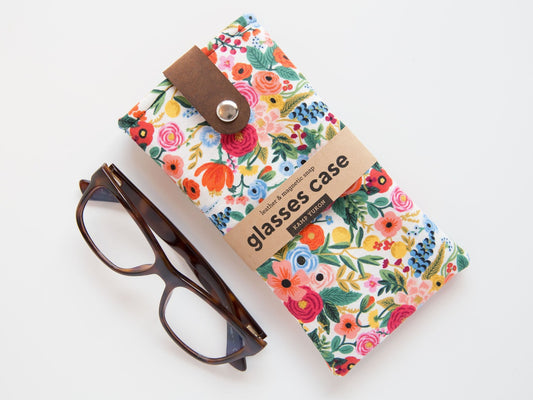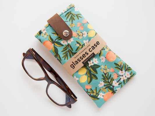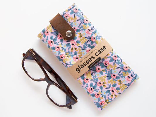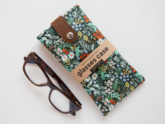 This padded case works great for glasses and sunglasses. Easily accessible with a magnetic snap on a genuine leather strap