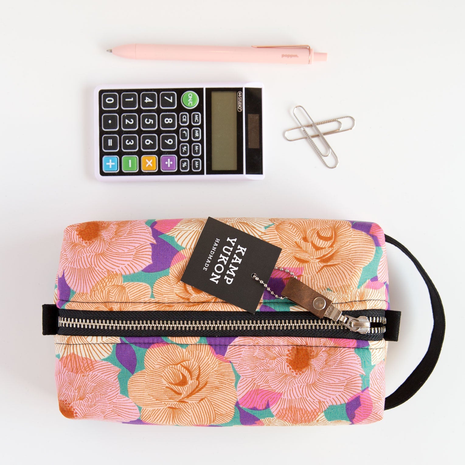 With just the right amount of batting and interfacing, this bag is soft and sturdy. Featuring a canvas handle, metal YKK zipper, leather zipper pull and two tabs for easy zipping and unzipping. Made from high-quality materials and built to last.