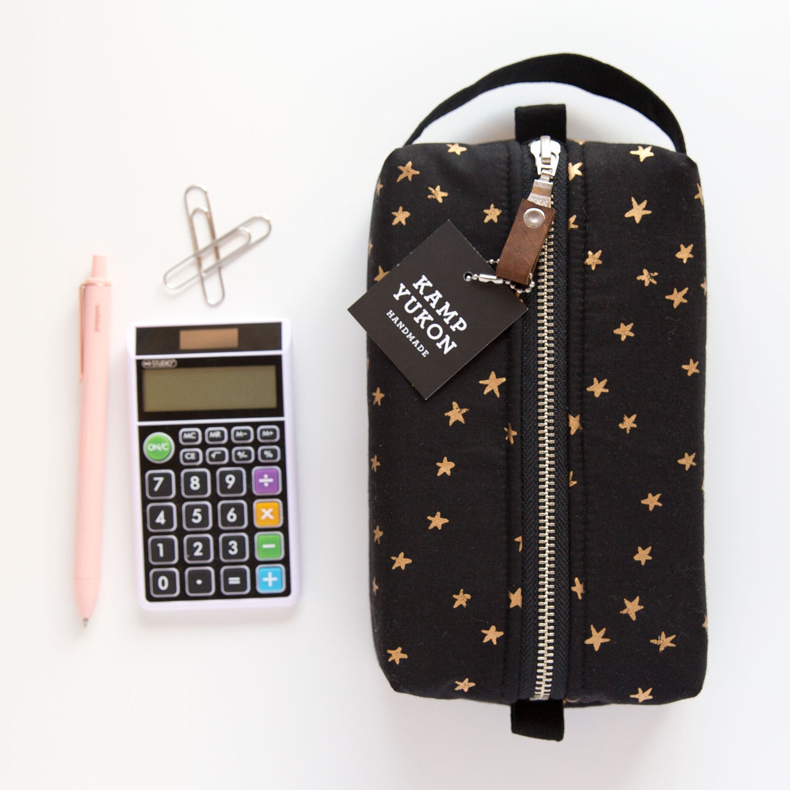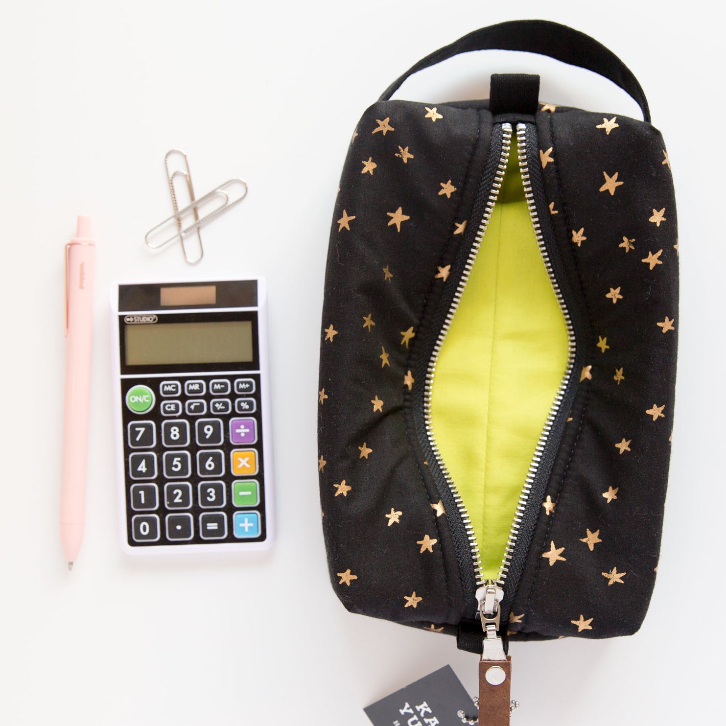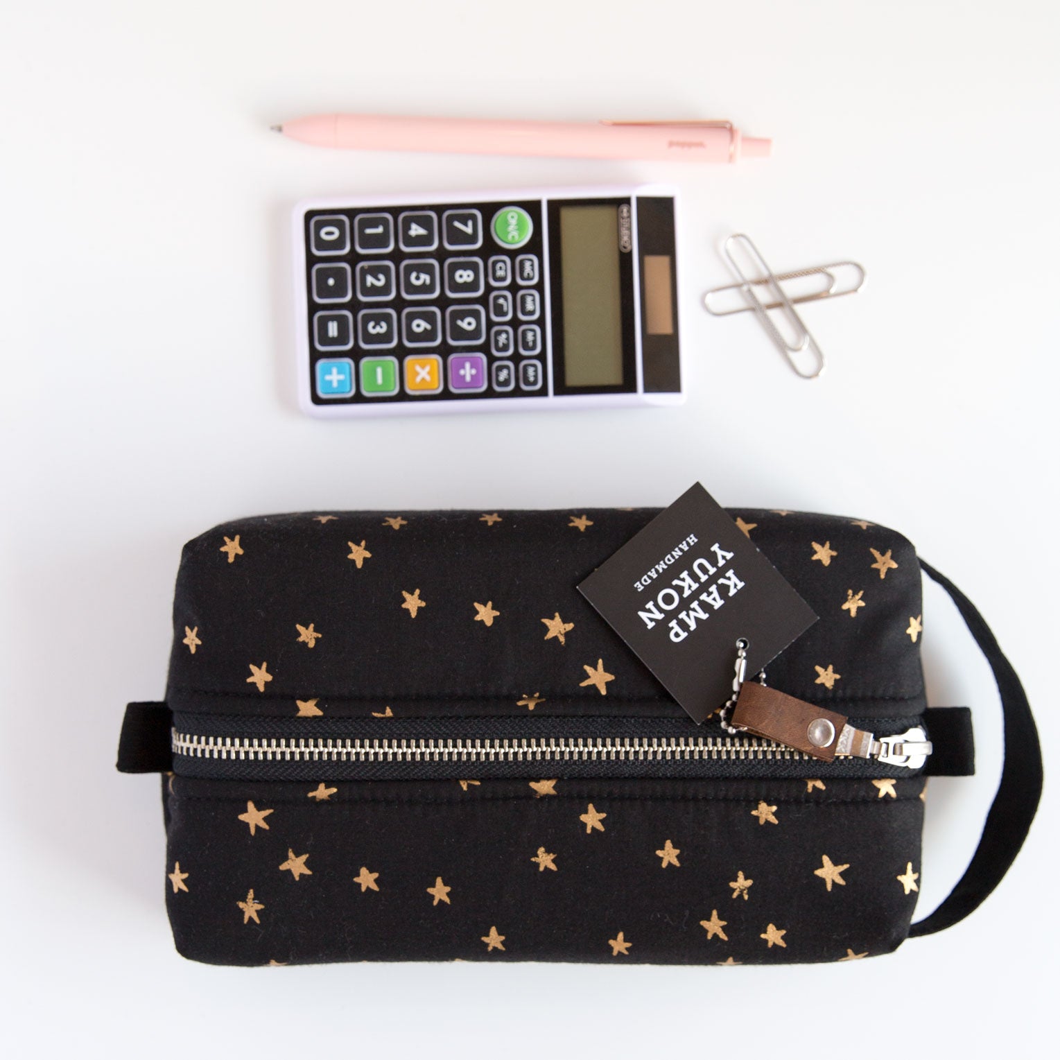 With just the right amount of batting and interfacing, this bag is soft and sturdy. Featuring a canvas handle, metal YKK zipper, leather zipper pull and two tabs for easy zipping and unzipping. Made from high-quality materials and built to last.