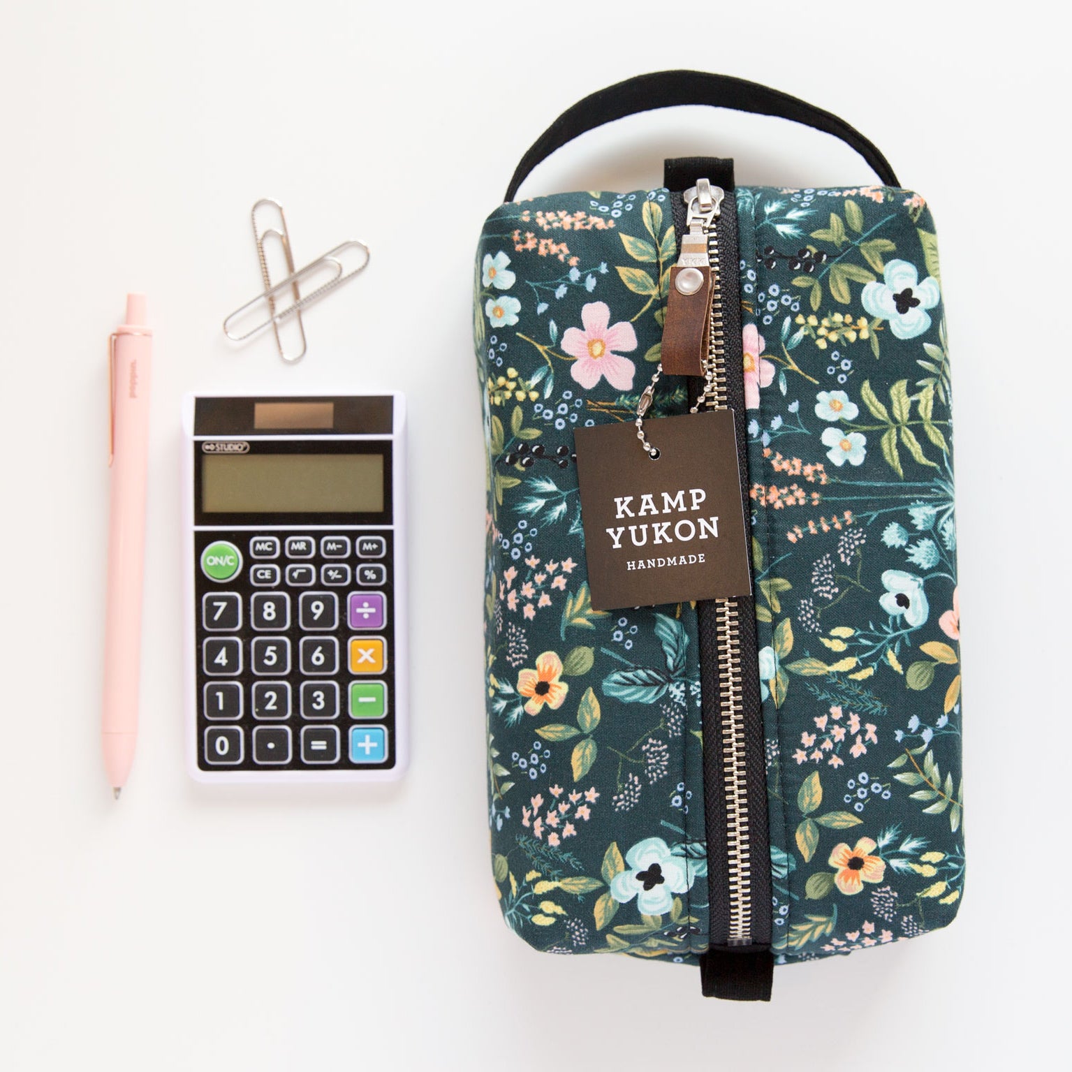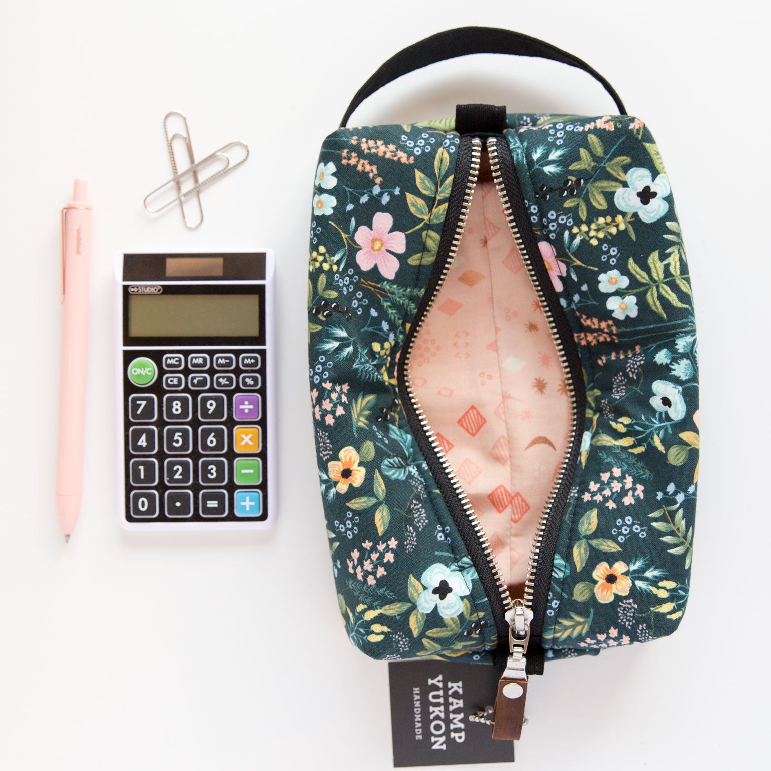 With just the right amount of batting and interfacing, this bag is soft and sturdy. Featuring a canvas handle, metal YKK zipper, leather zipper pull and two tabs for easy zipping and unzipping. Made from high-quality materials and built to last.