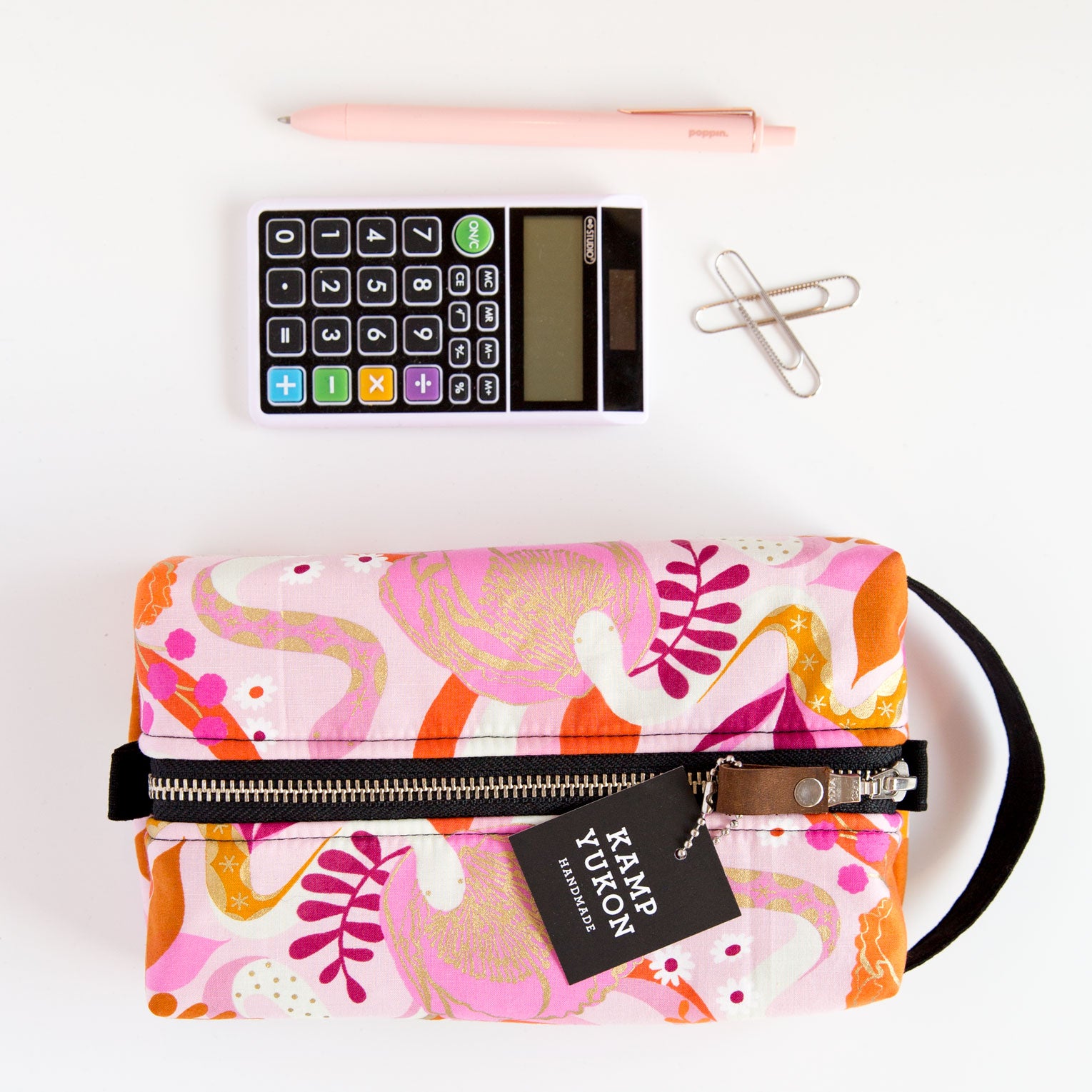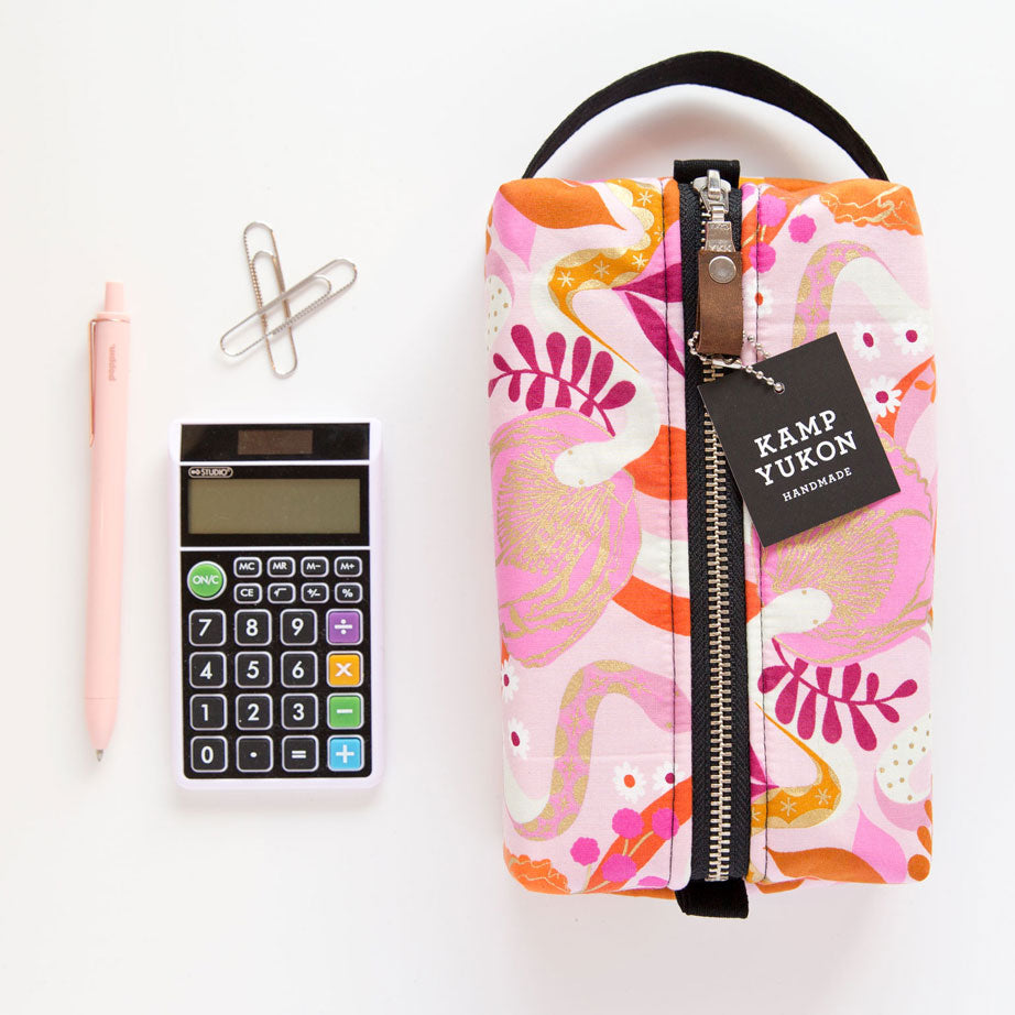 With just the right amount of batting and interfacing, this bag is soft and sturdy. Featuring a canvas handle, metal YKK zipper, leather zipper pull and two tabs for easy zipping and unzipping. Made from high-quality materials and built to last.
