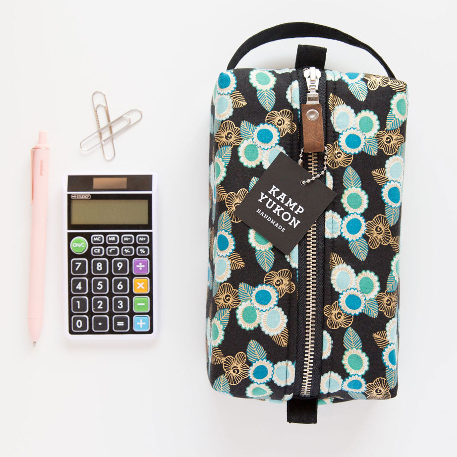 With just the right amount of batting and interfacing, this bag is soft and sturdy. Featuring a canvas handle, metal YKK zipper, leather zipper pull and two tabs for easy zipping and unzipping. Made from high-quality materials and built to last.