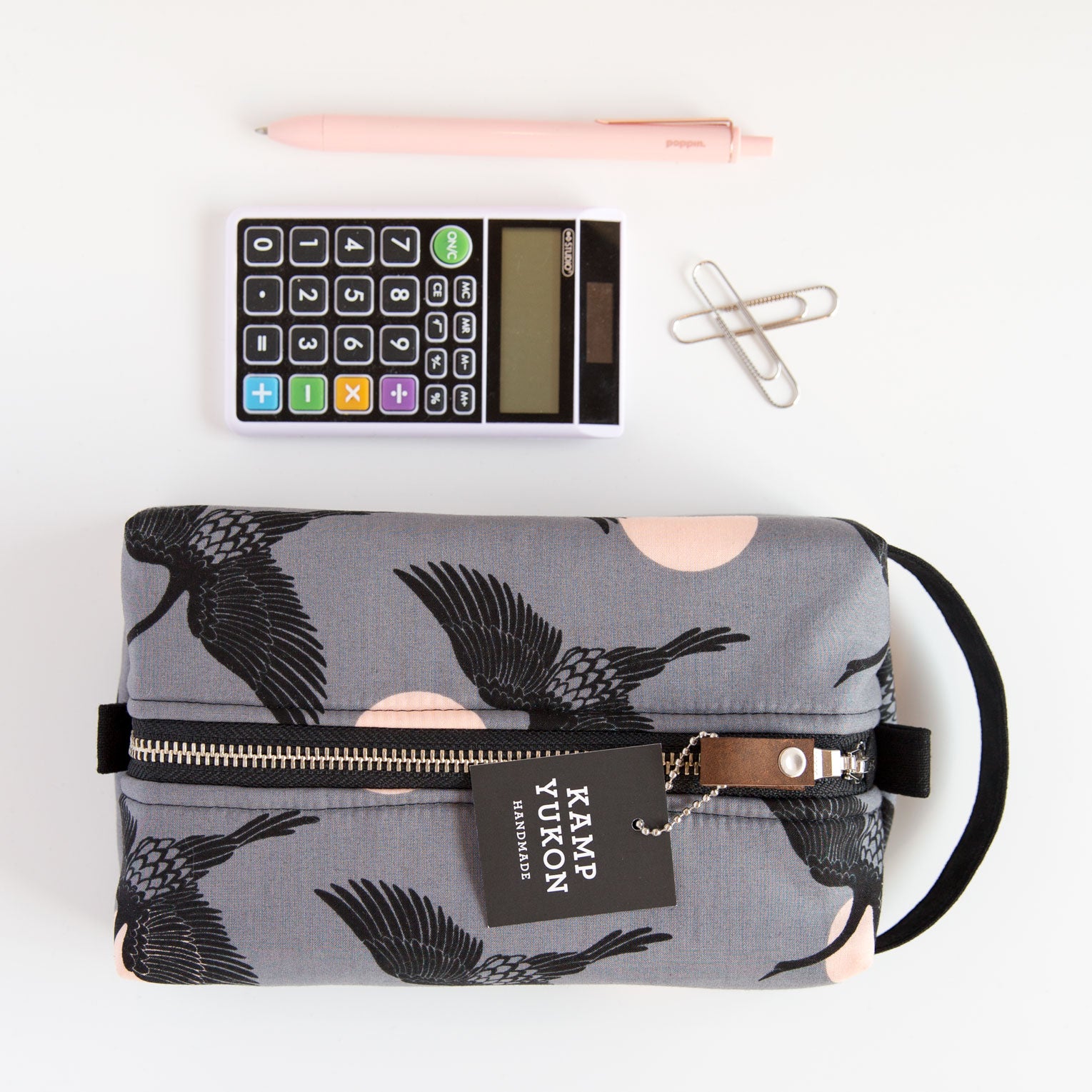 With just the right amount of batting and interfacing, this bag is soft and sturdy. Featuring a canvas handle, metal YKK zipper, leather zipper pull and two tabs for easy zipping and unzipping. Made from high-quality materials and built to last.