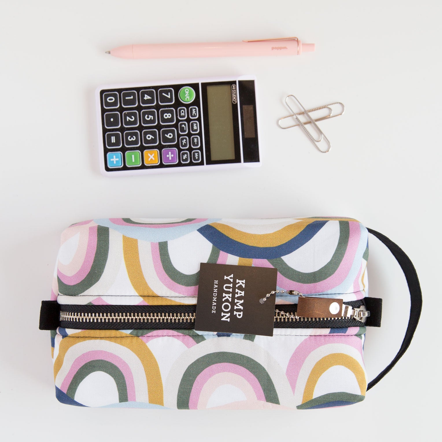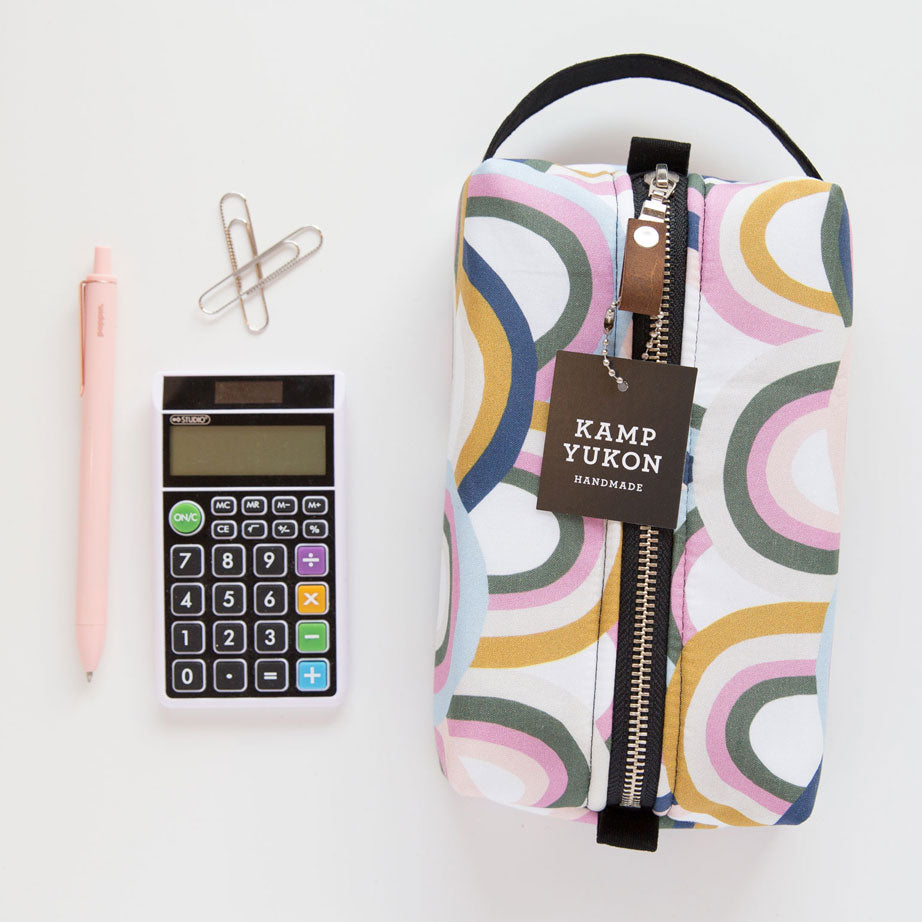 With just the right amount of batting and interfacing, this bag is soft and sturdy. Featuring a canvas handle, metal YKK zipper, leather zipper pull and two tabs for easy zipping and unzipping. Made from high-quality materials and built to last.