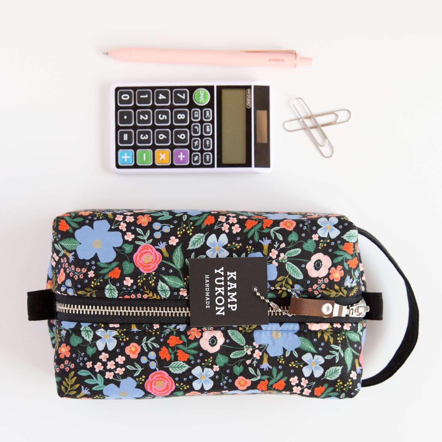 With just the right amount of batting and interfacing, this bag is soft and sturdy. Featuring a canvas handle, metal YKK zipper, leather zipper pull and two tabs for easy zipping and unzipping. Made from high-quality materials and built to last.