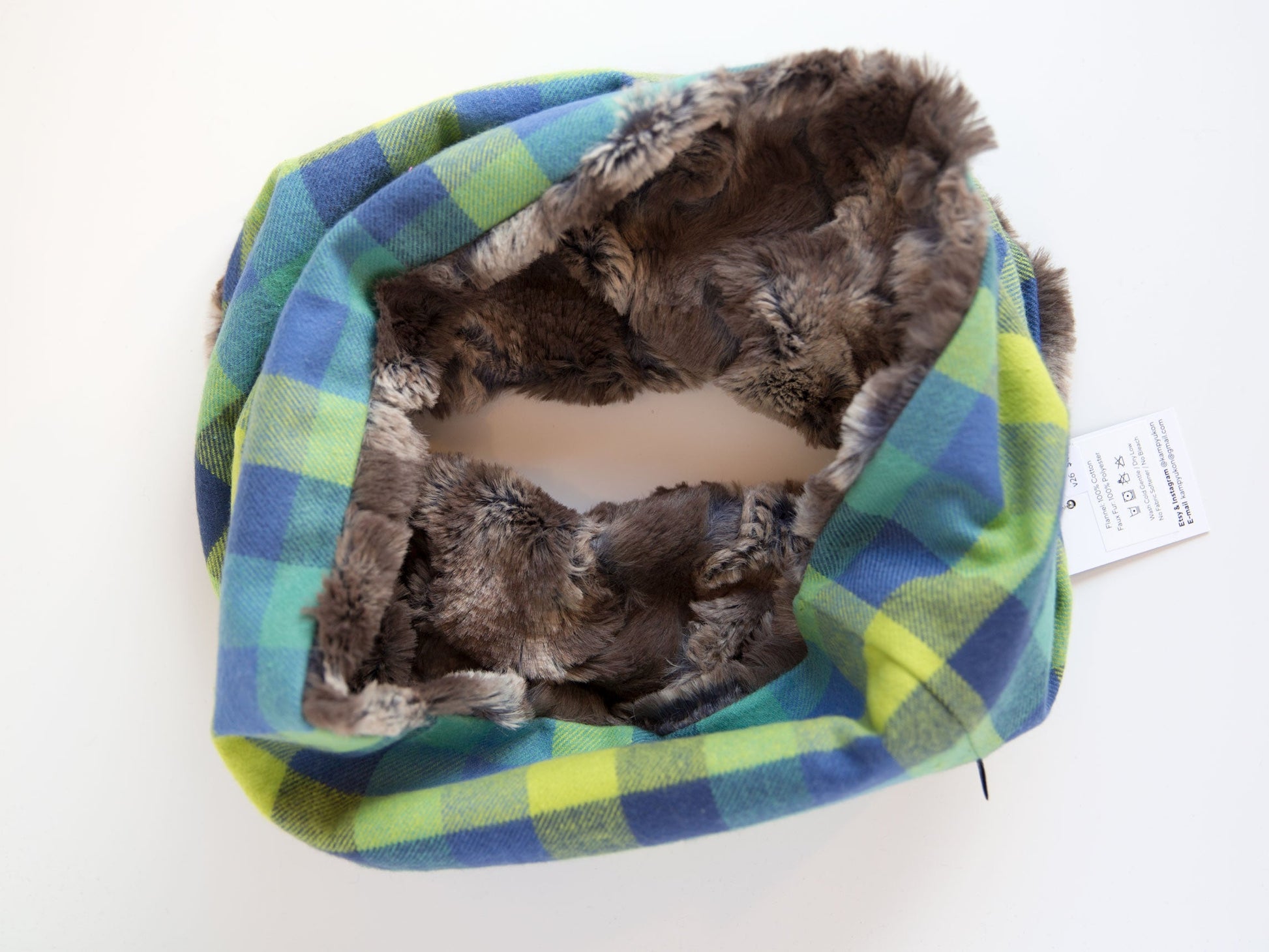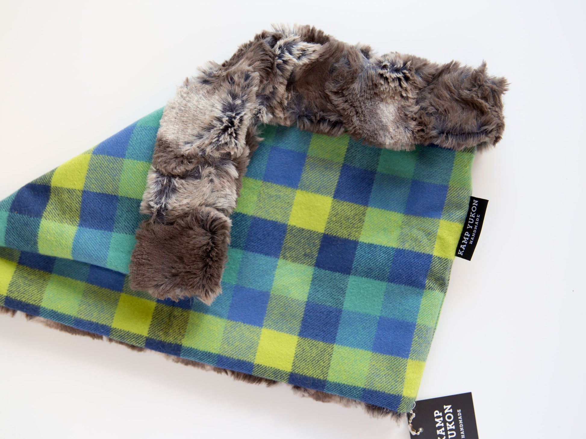 These neck warmers are the perfect accessory to keep you cozy this fall and winter (and maybe year-round in the Yukon). Reversible with a fun flannel on one side and a super soft minky fur on the other.