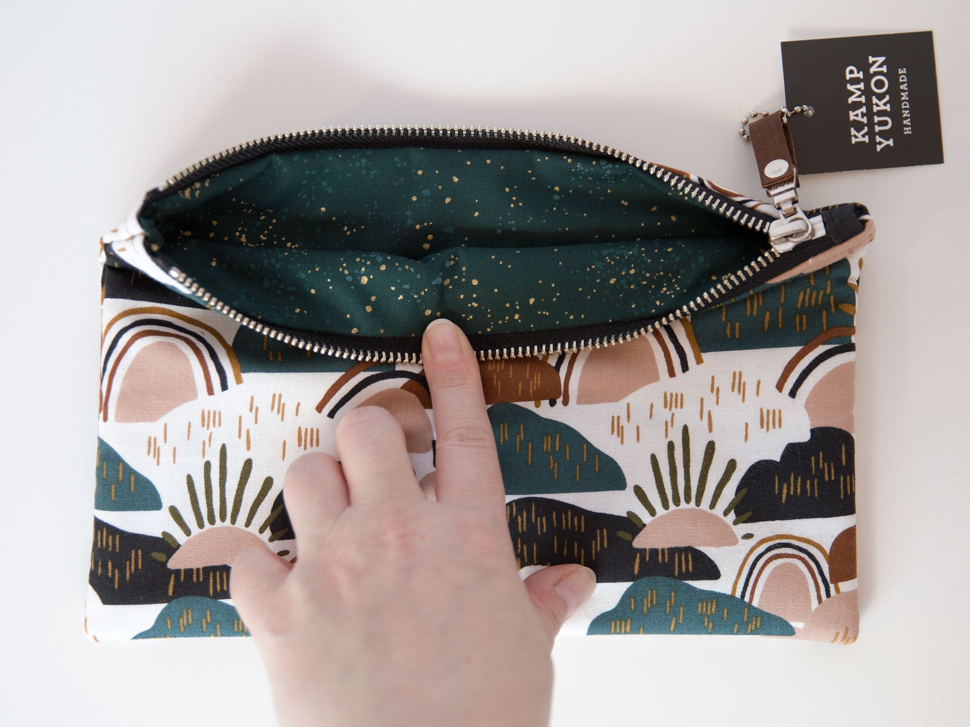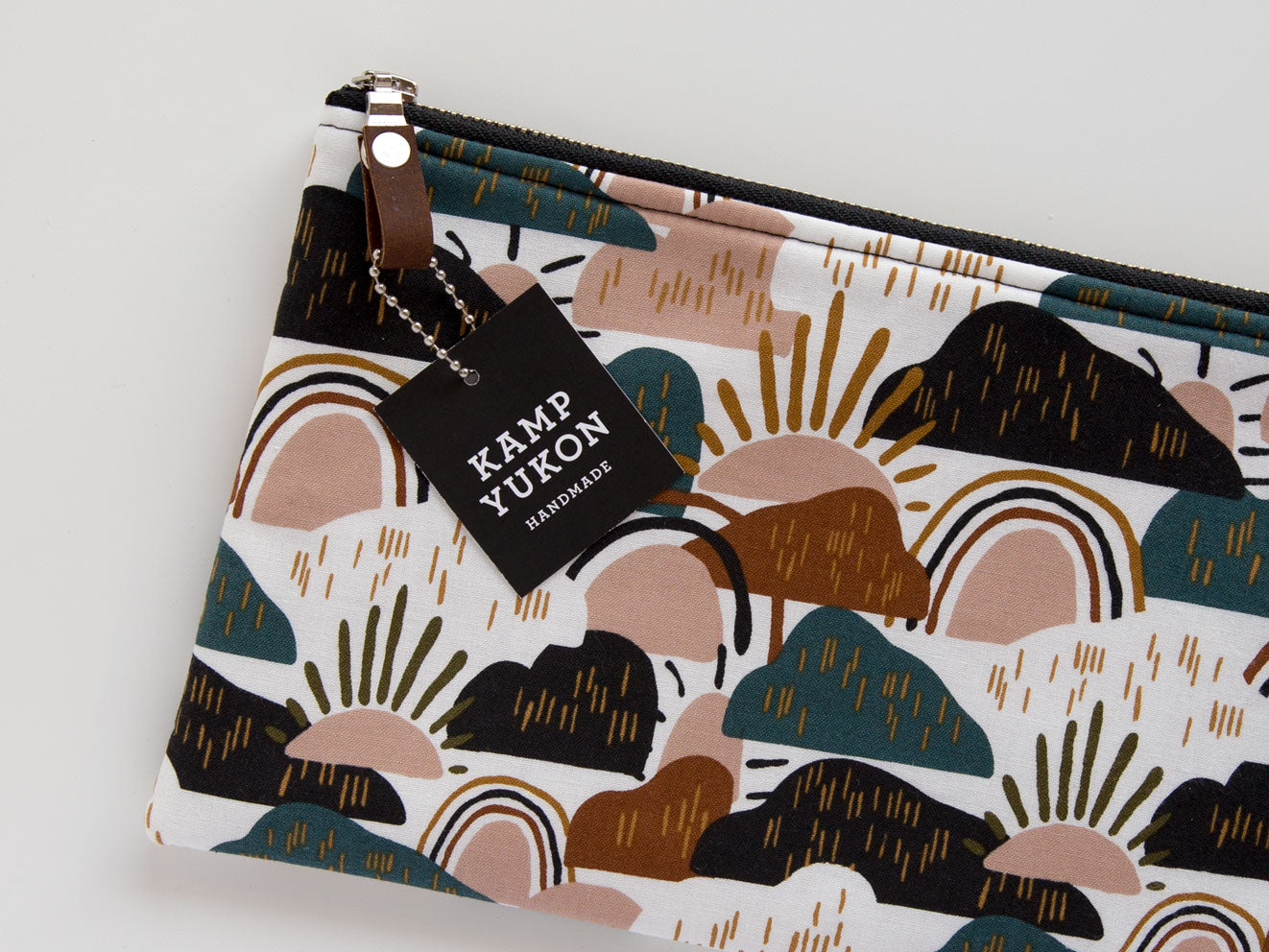 With just the right amount of batting, this bag is soft and sturdy. Featuring a metal YKK zipper, leather zipper pull, and designer cotton fabric. Made from high-quality materials and built to last.