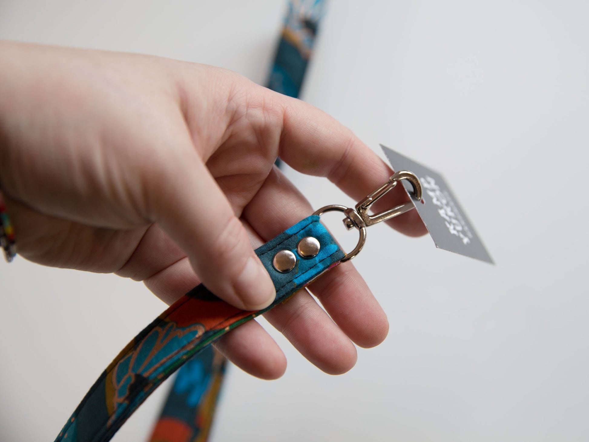 Designed with a half twist so it curves comfortably on your neck and lays flat on your chest. The swivel clip is secured with two rivets adding security and a little shine. Lightly interfaced to provide just the right amount of strength without feeling too stiff or bulky.