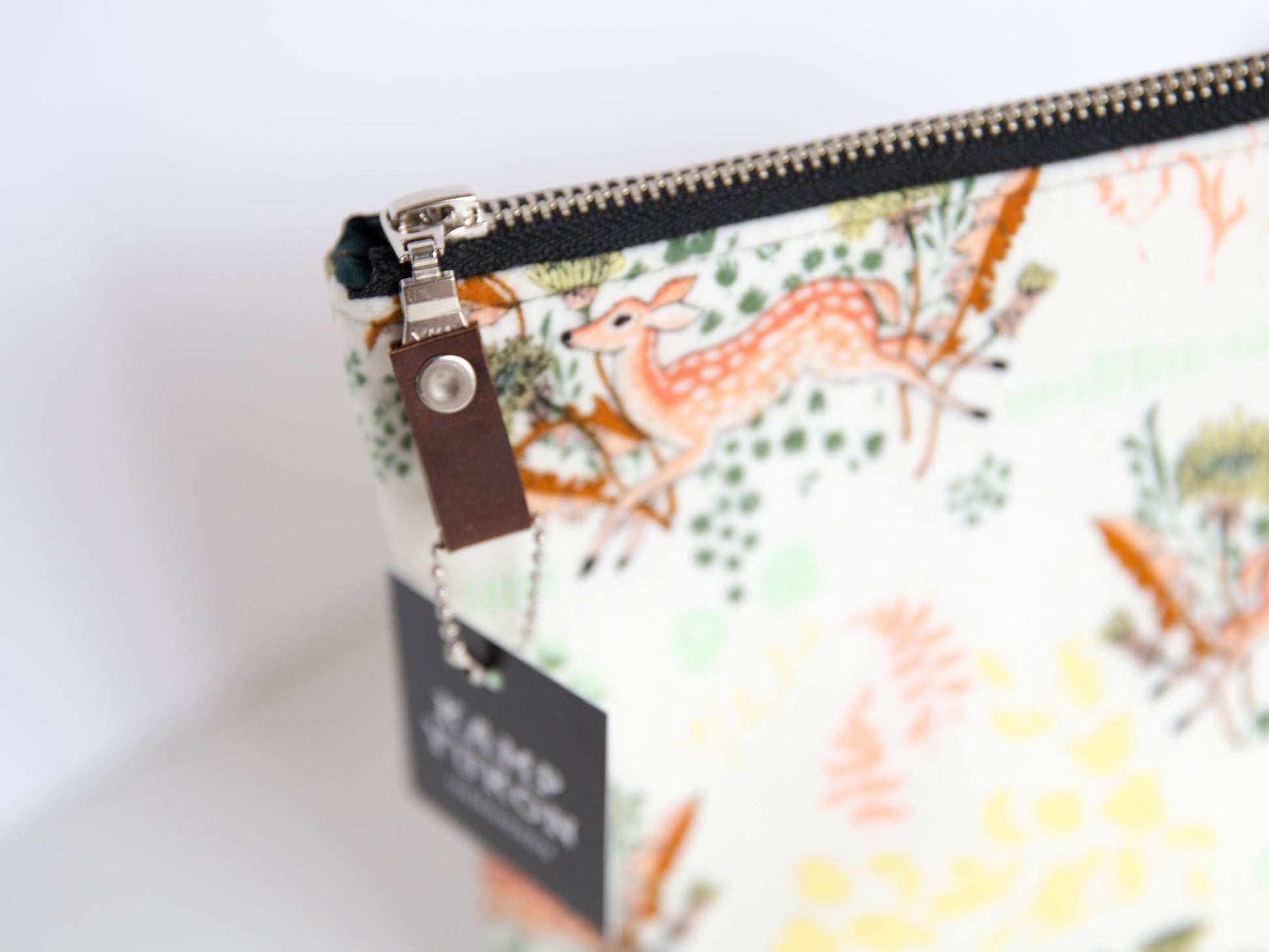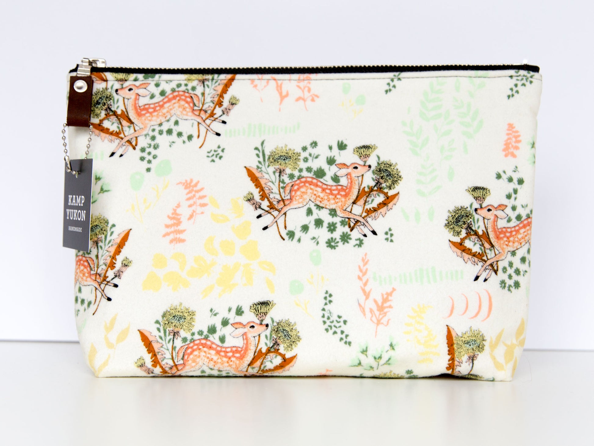 With just the right amount of batting and interfacing, this bag is soft and sturdy. Featuring a metal YKK zipper, leather zipper pull, and designer cotton fabric. Made from high-quality materials and built to last.