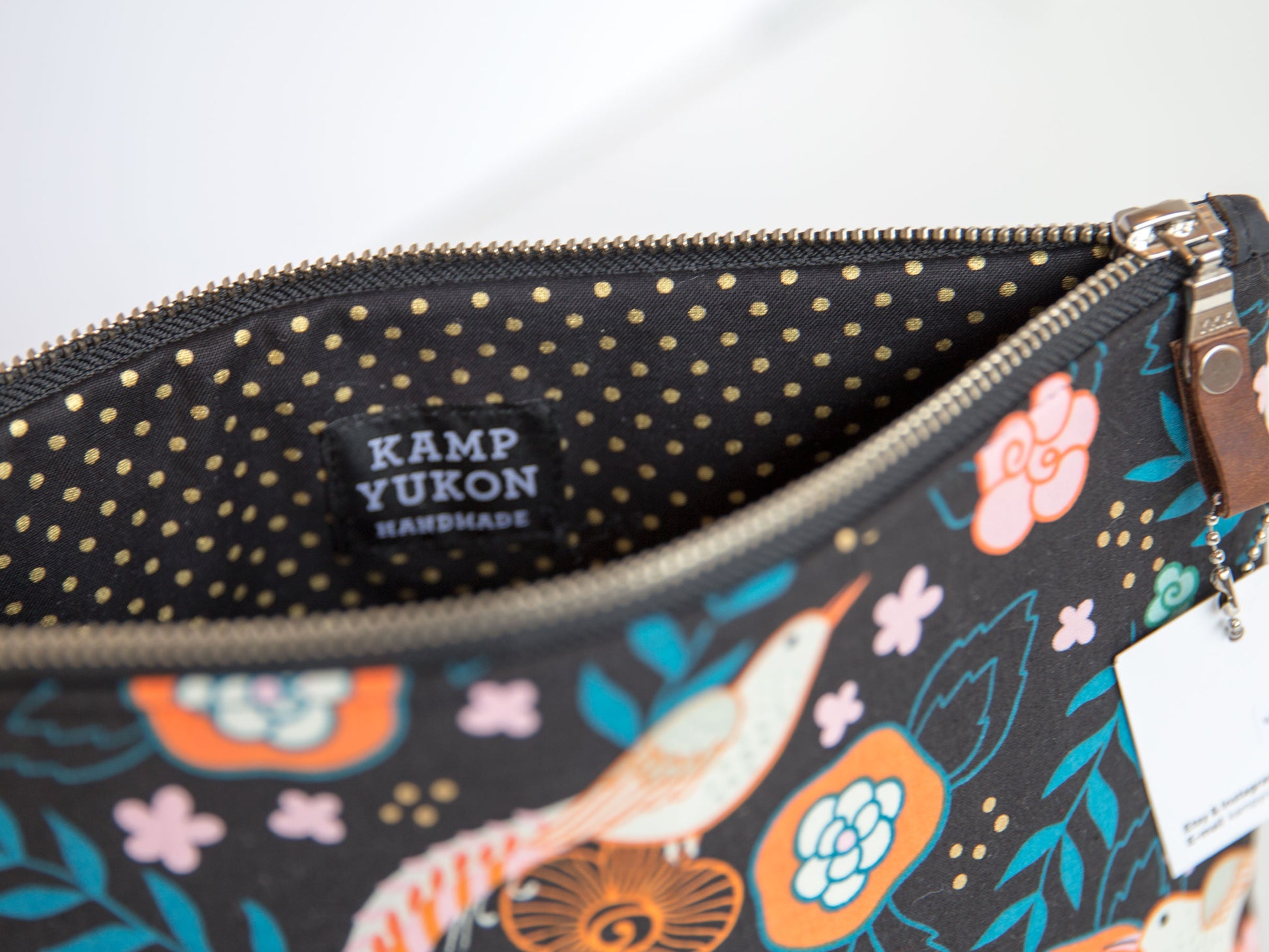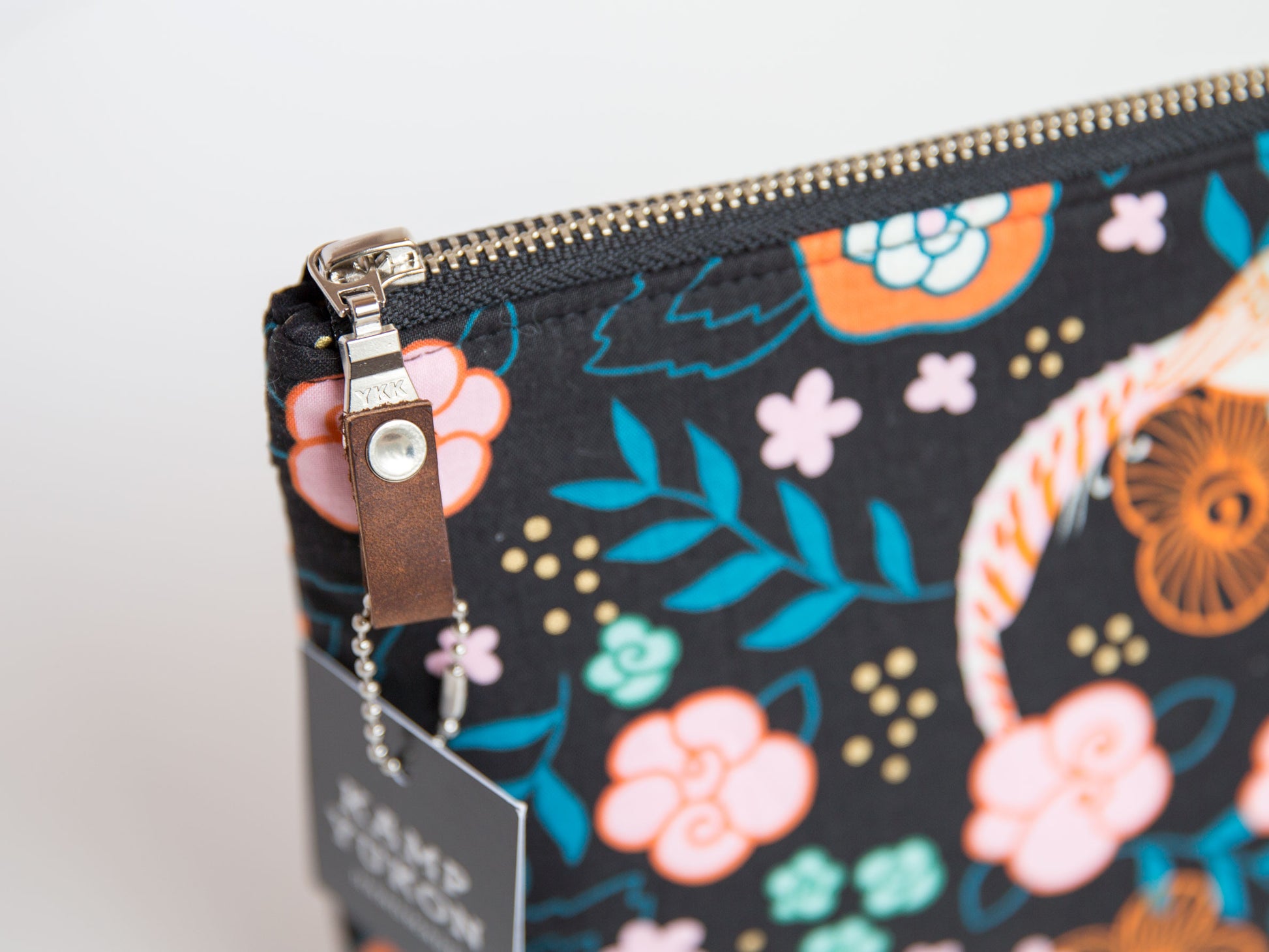With just the right amount of batting and interfacing, this bag is soft and sturdy. Featuring a metal YKK zipper, leather zipper pull, and designer cotton fabric. Made from high-quality materials and built to last.