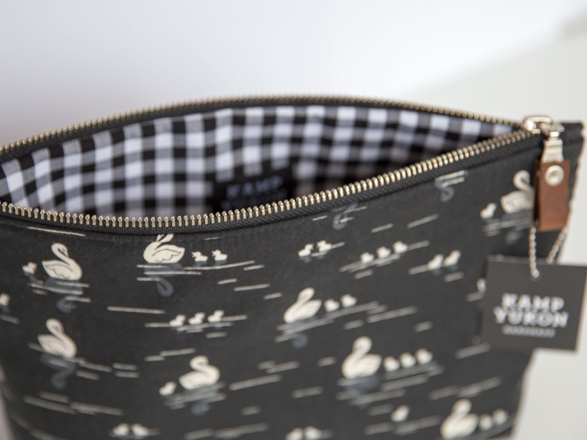 With just the right amount of batting and interfacing, this bag is soft and sturdy. Featuring a metal YKK zipper, leather zipper pull, and designer cotton fabric. Made from high-quality materials and built to last.