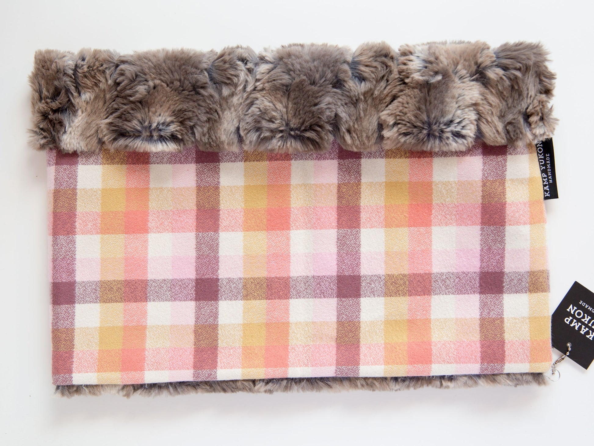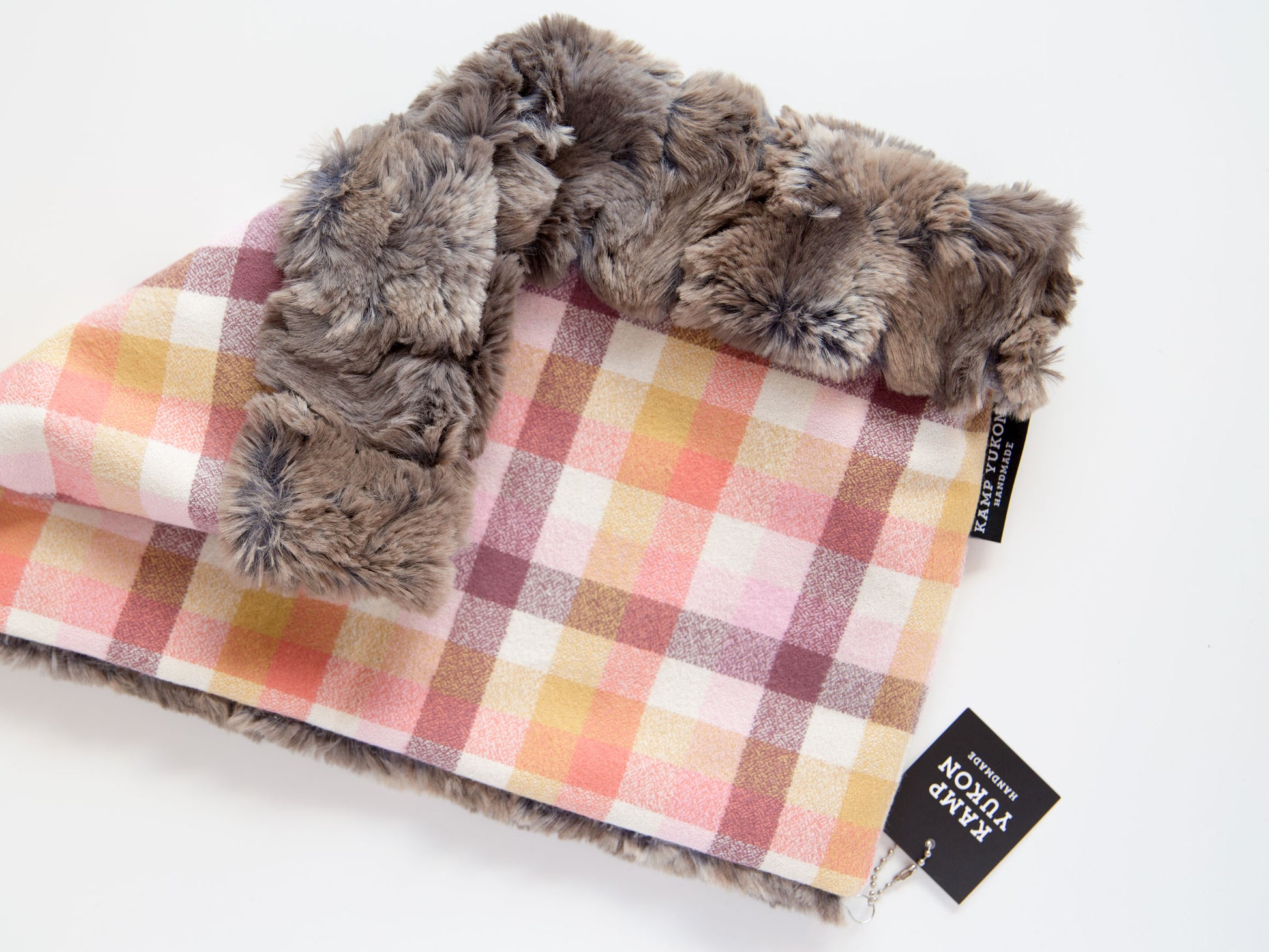 These neck warmers are the perfect accessory to keep you cozy this fall and winter (and maybe year-round in the Yukon). Reversible with a fun flannel on one side and a super soft minky fur on the other.