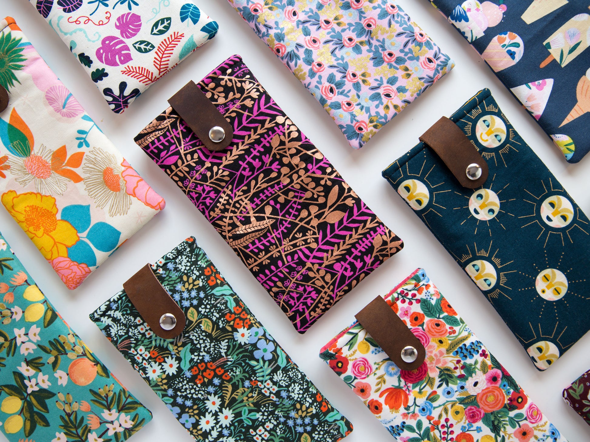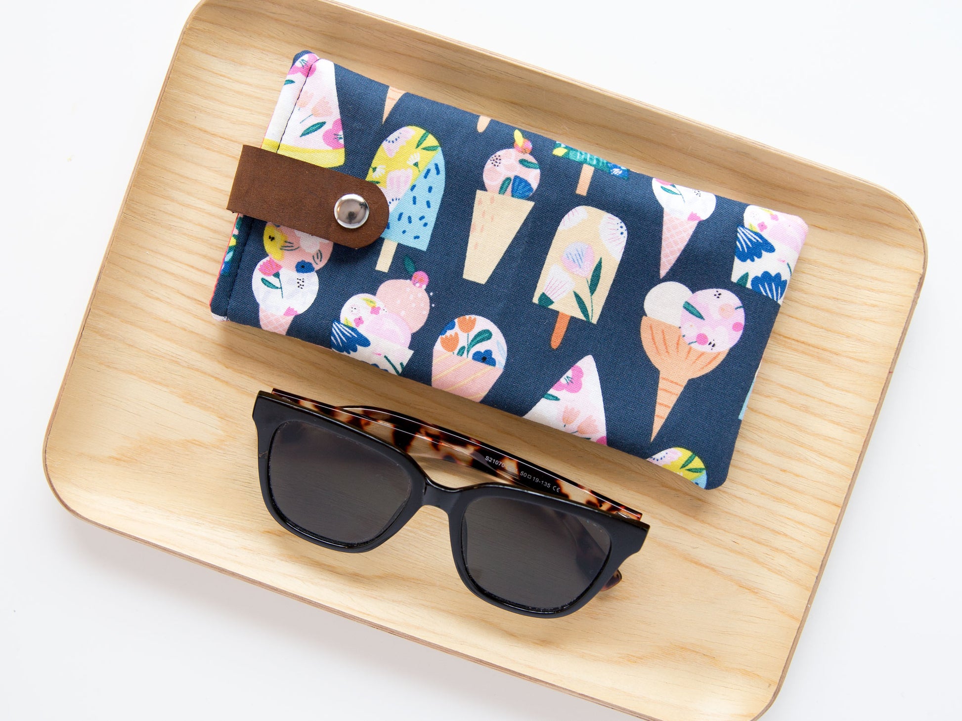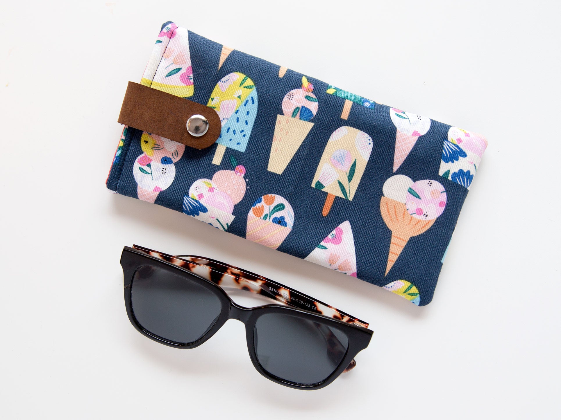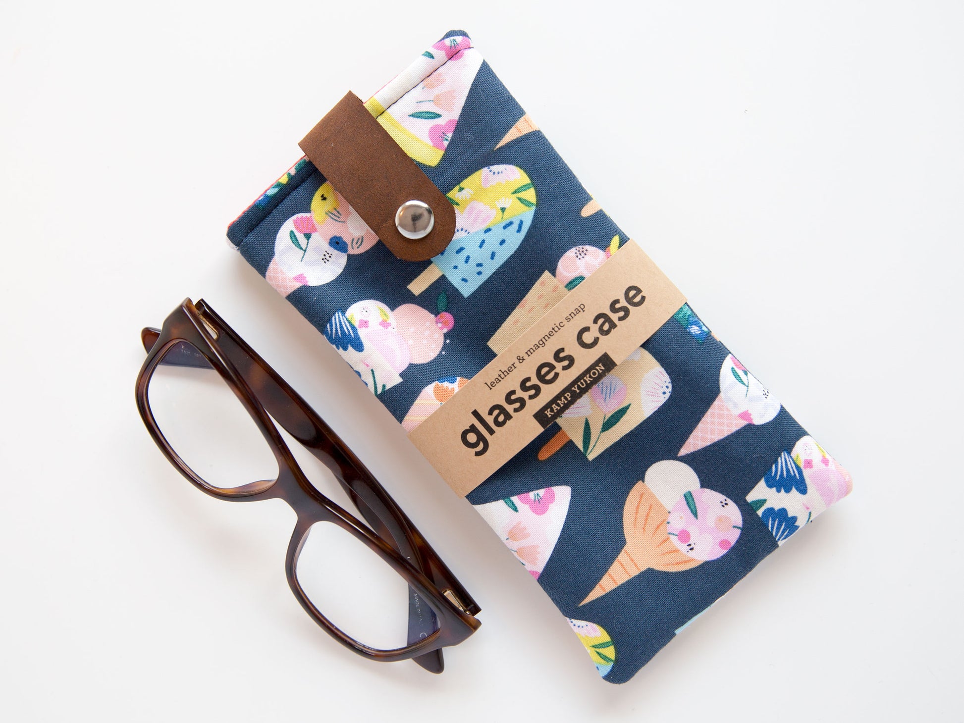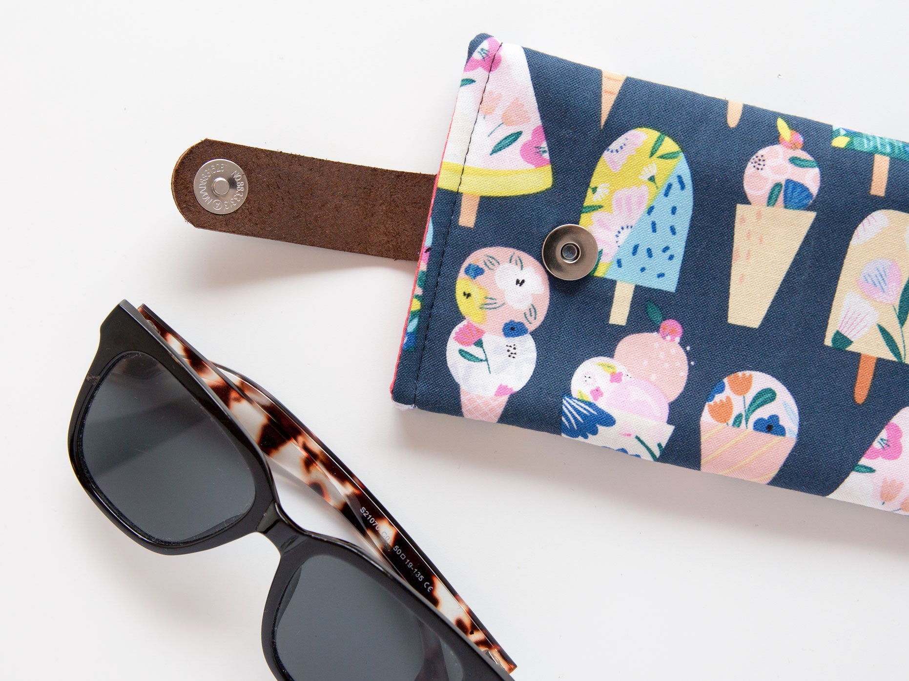 Keep your glasses and sunglasses safe and secure with this padded case. Easily accessible with a magnetic snap on a leather strap.