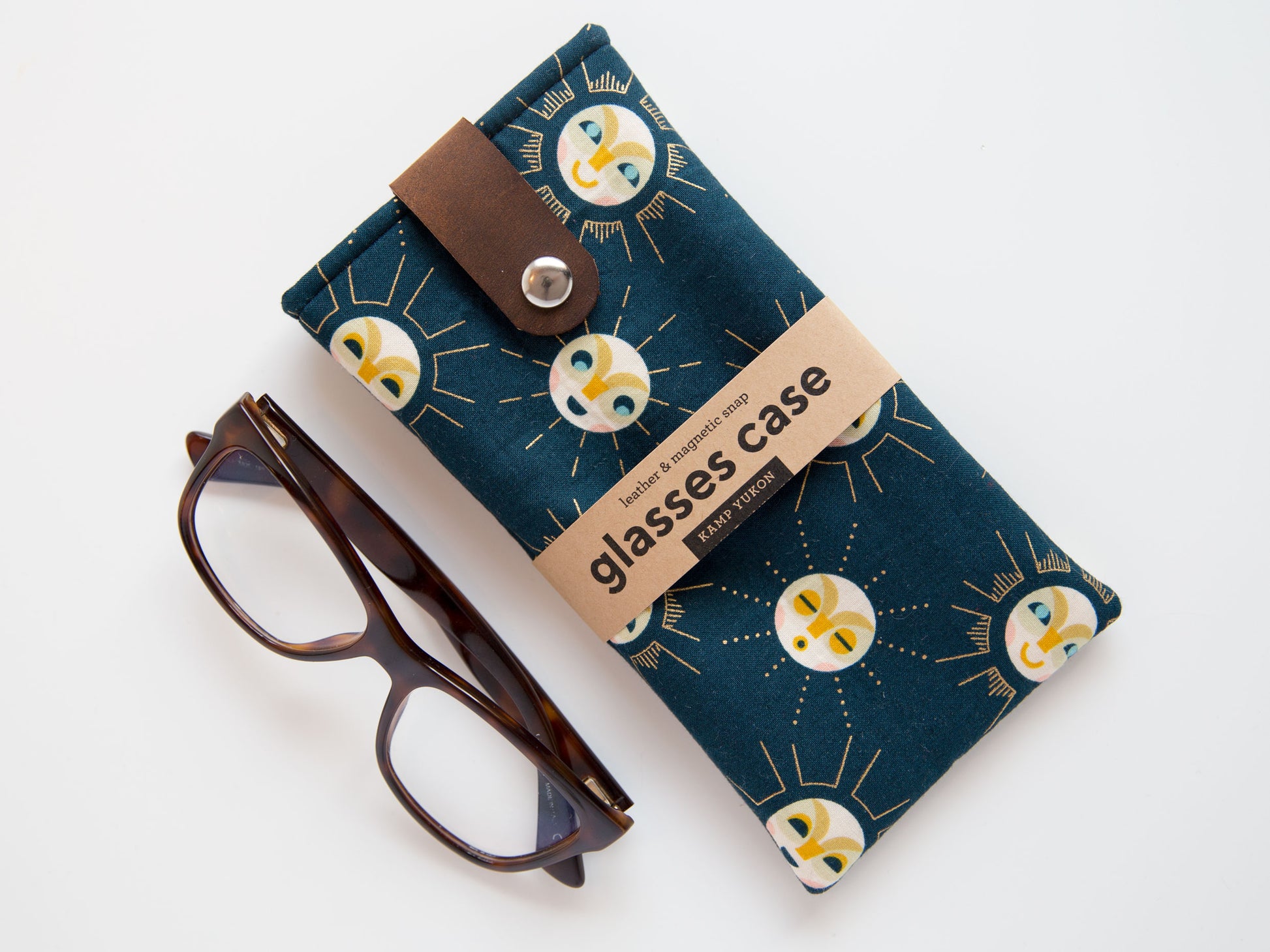 Keep your glasses and sunglasses safe and secure with this padded case. Easily accessible with a magnetic snap on a leather strap.