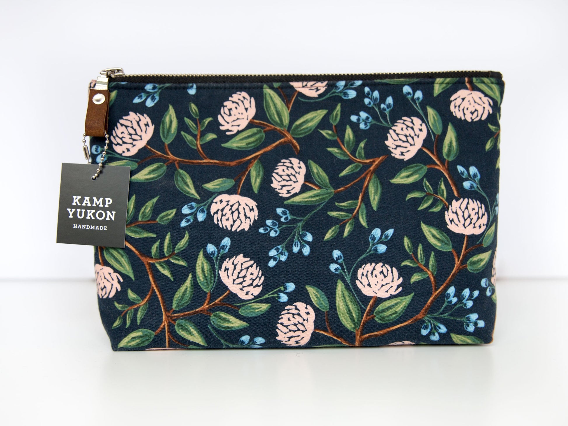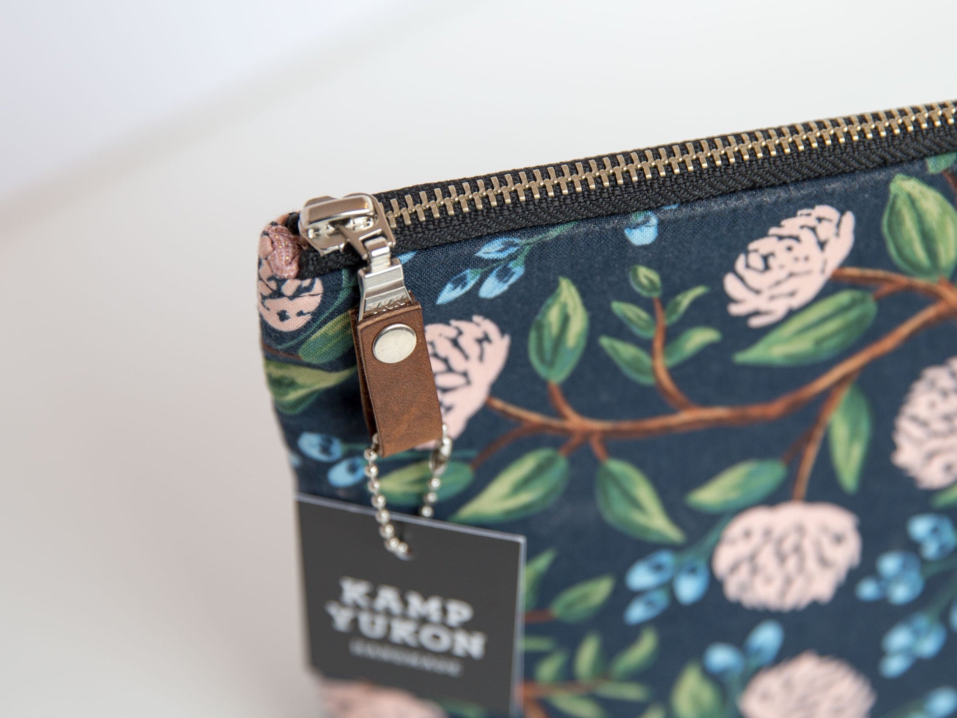 With just the right amount of batting and interfacing, this bag is soft and sturdy. Featuring a metal YKK zipper, leather zipper pull, and designer cotton fabric. Made from high-quality materials and built to last.