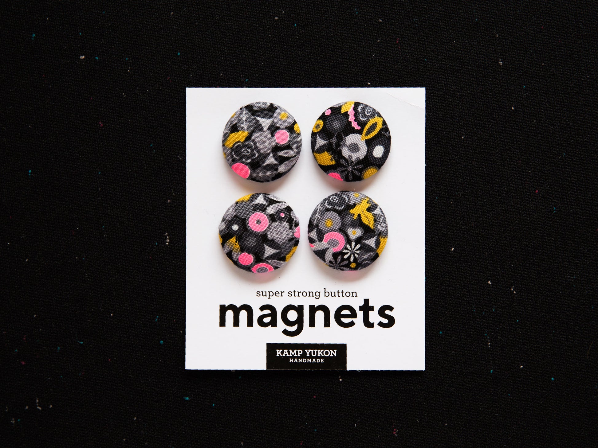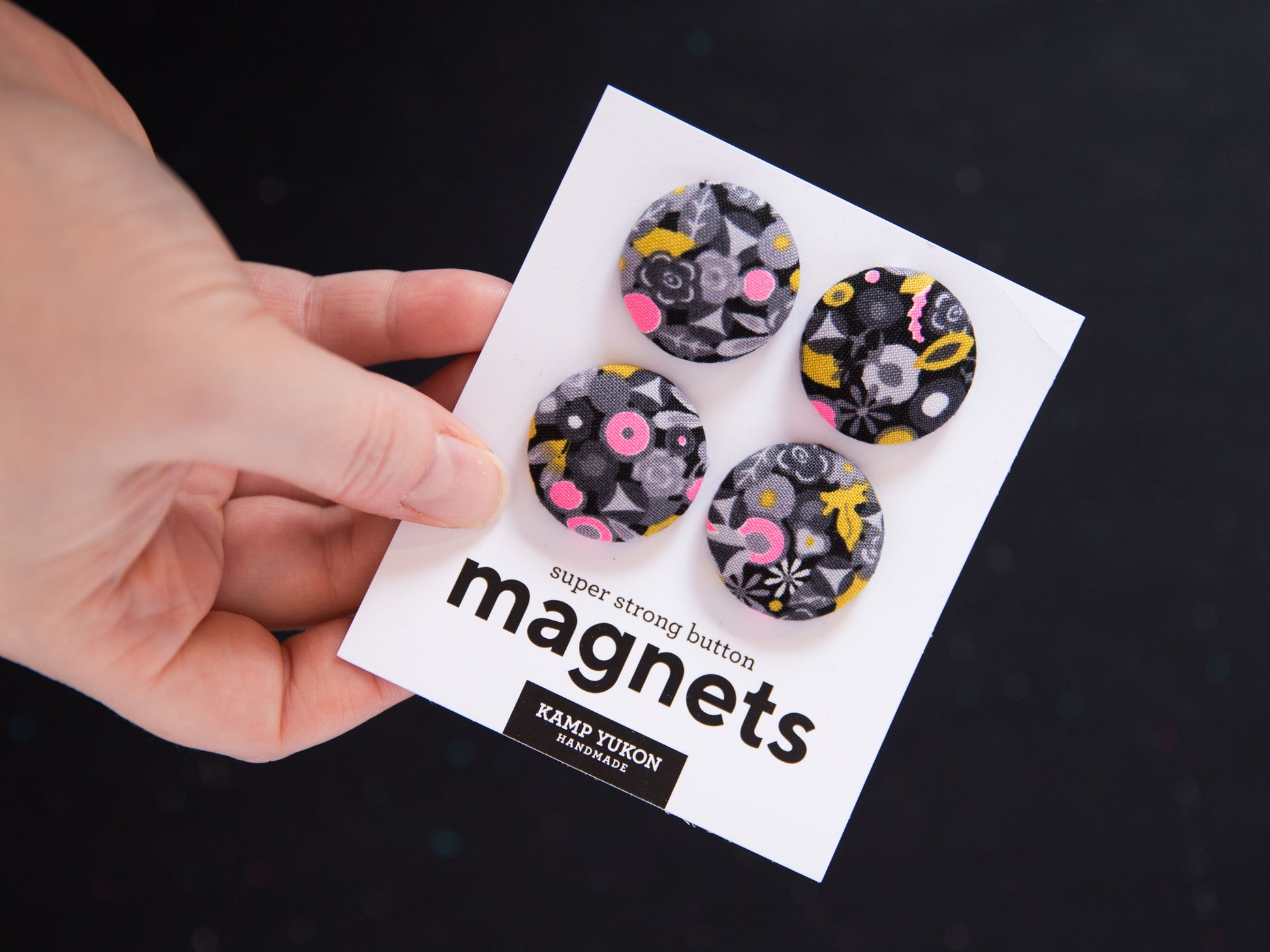 These magnet sets are an excellent way to add little pops of fun in your home or office. Each set includes four fabric-covered buttons securely attached to strong neodymium magnets and is packaged for easy gifting. They can be used on a variety of metal surfaces like fridges, lockers, dishwashers, filing cabinets, or toolboxes to name a few.