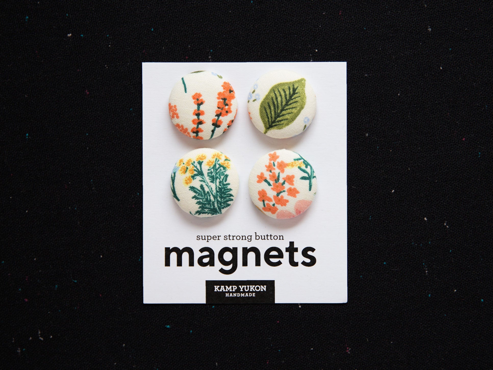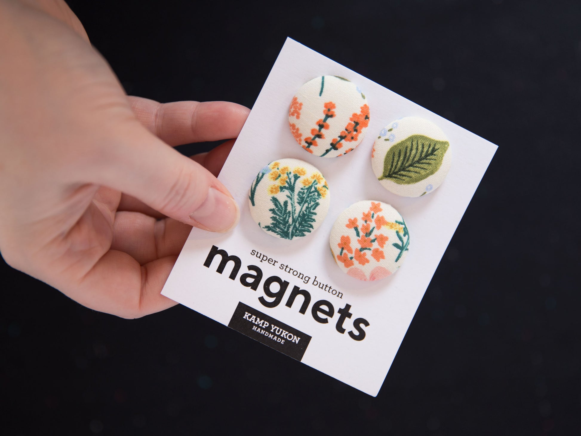 These magnet sets are an excellent way to add little pops of fun in your home or office. Each set includes four fabric-covered buttons securely attached to strong neodymium magnets and is packaged for easy gifting. They can be used on a variety of metal surfaces like fridges, lockers, dishwashers, filing cabinets, or toolboxes to name a few.