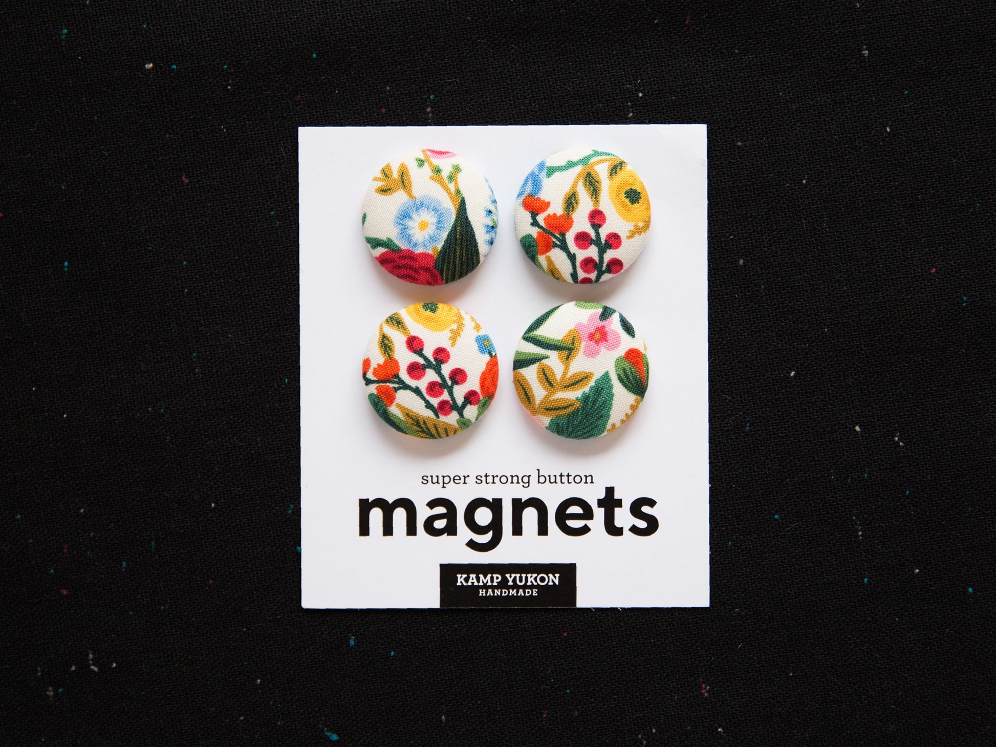 These magnet sets are an excellent way to add little pops of fun in your home or office. Each set includes four fabric-covered buttons securely attached to strong neodymium magnets and is packaged for easy gifting. They can be used on a variety of metal surfaces like fridges, lockers, dishwashers, filing cabinets, or toolboxes to name a few.