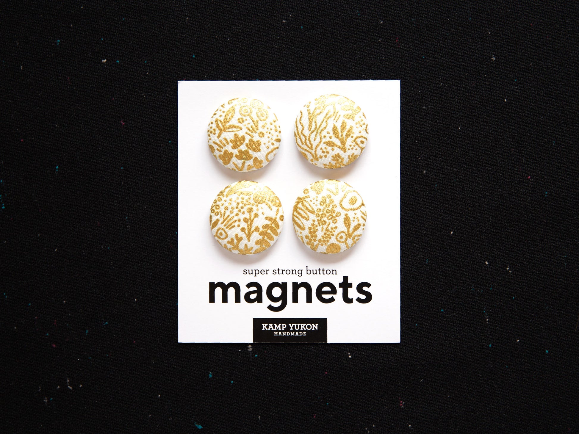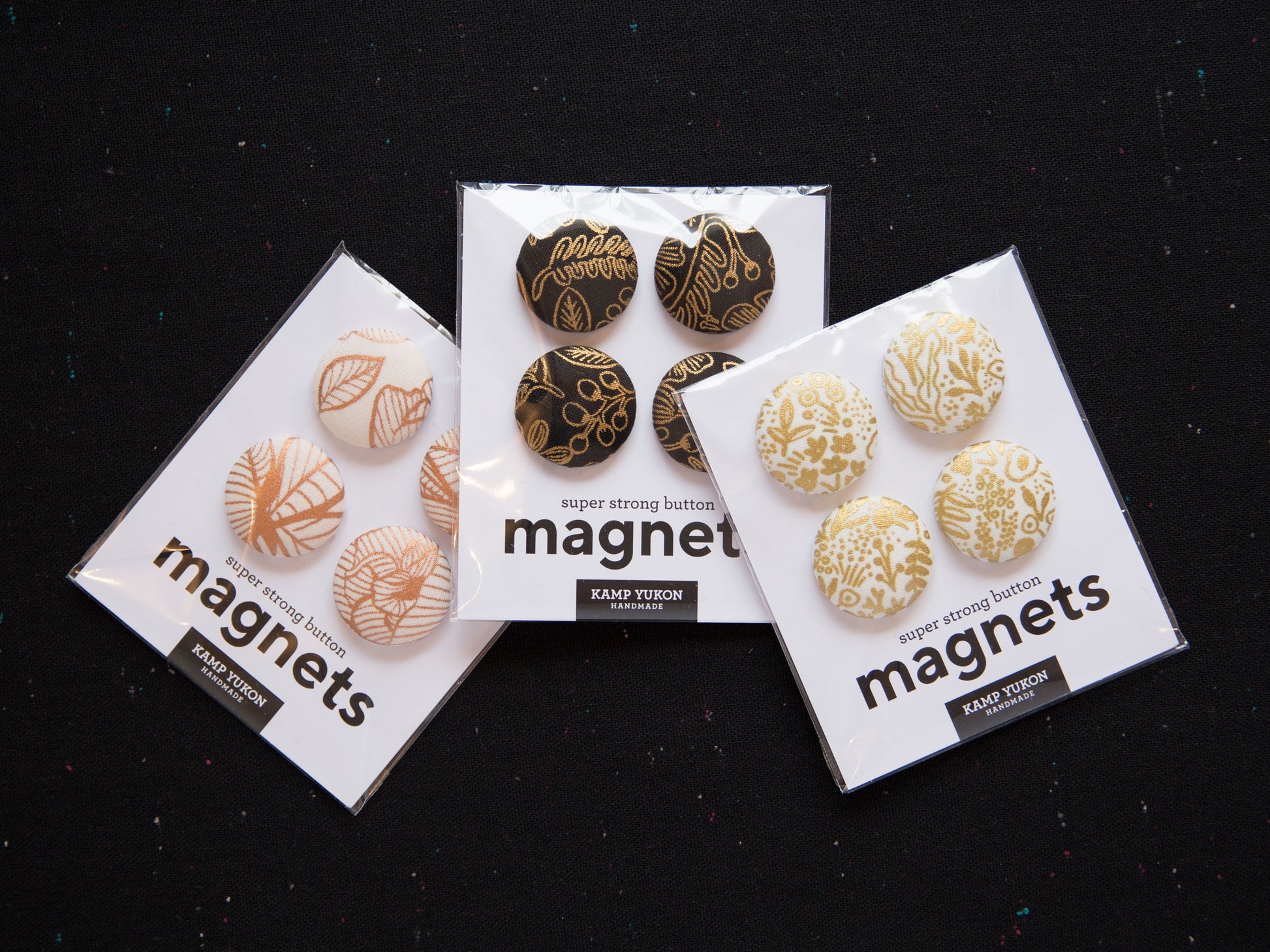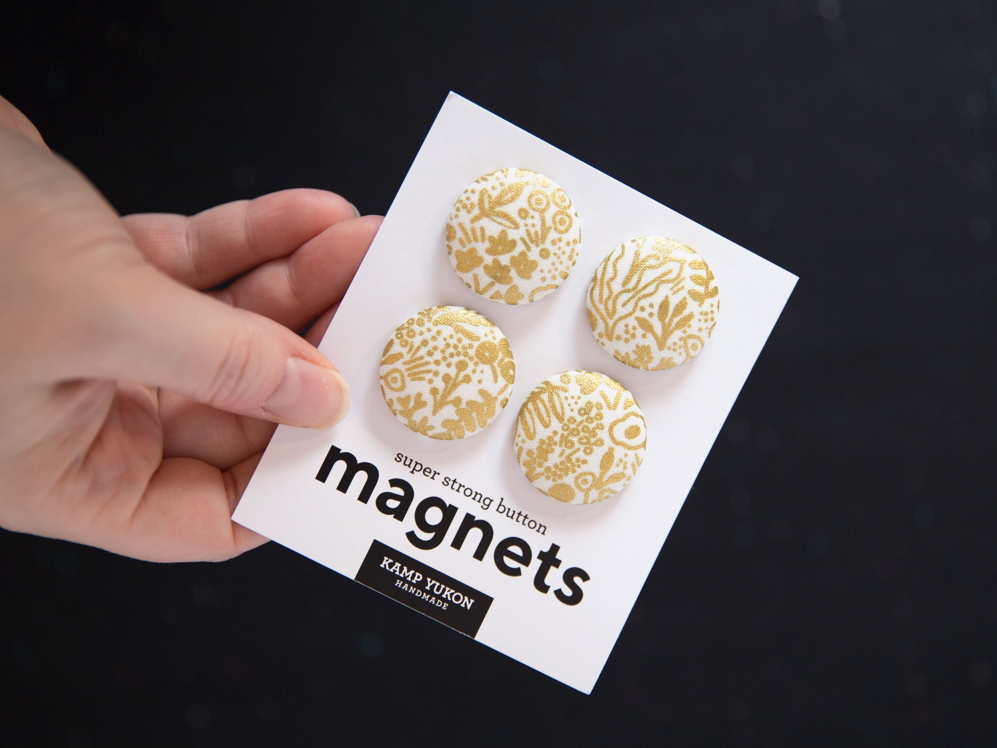 These magnet sets are an excellent way to add little pops of fun in your home or office. Each set includes four fabric-covered buttons securely attached to strong neodymium magnets and is packaged for easy gifting. They can be used on a variety of metal surfaces like fridges, lockers, dishwashers, filing cabinets, or toolboxes to name a few.