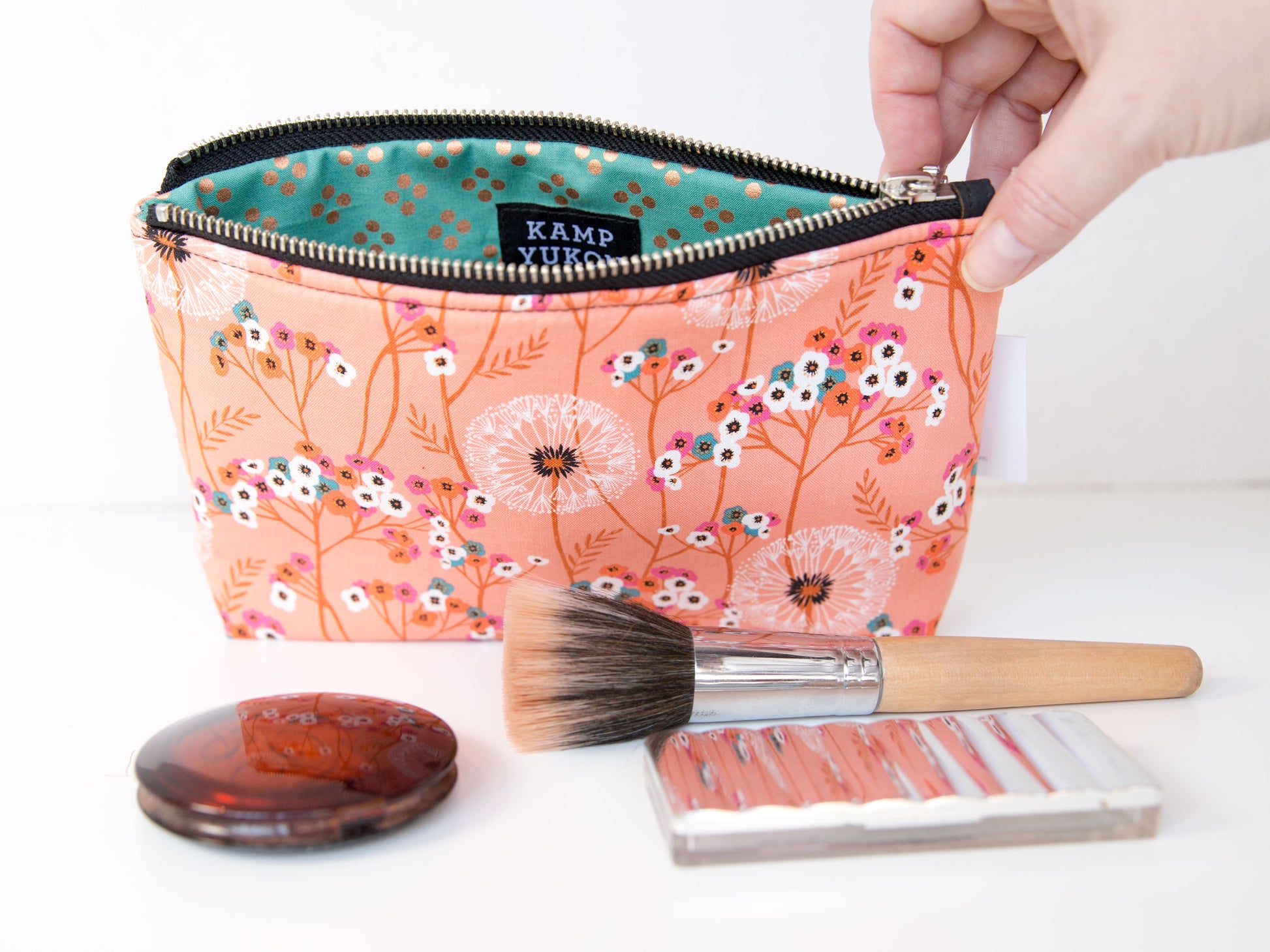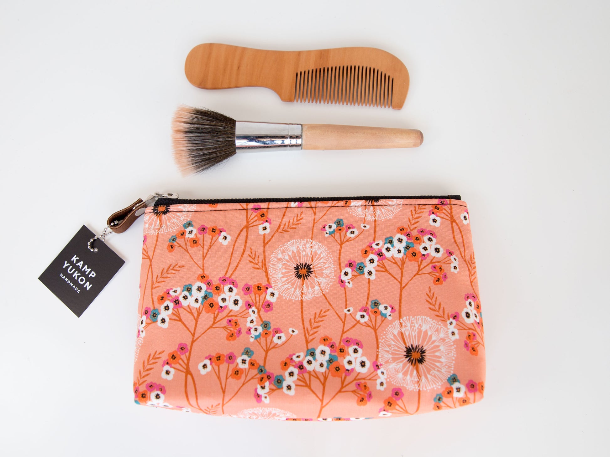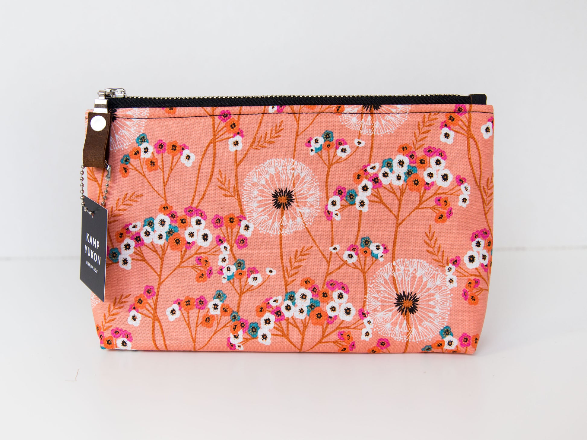 With just the right amount of batting and interfacing, this bag is soft and sturdy. Featuring a metal YKK zipper, leather zipper pull, and designer cotton fabric. Made from high-quality materials and built to last.