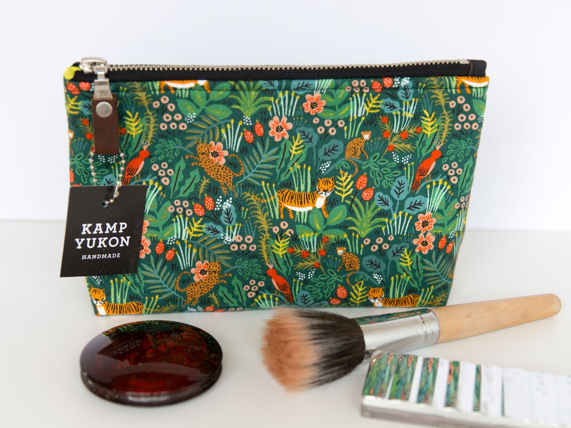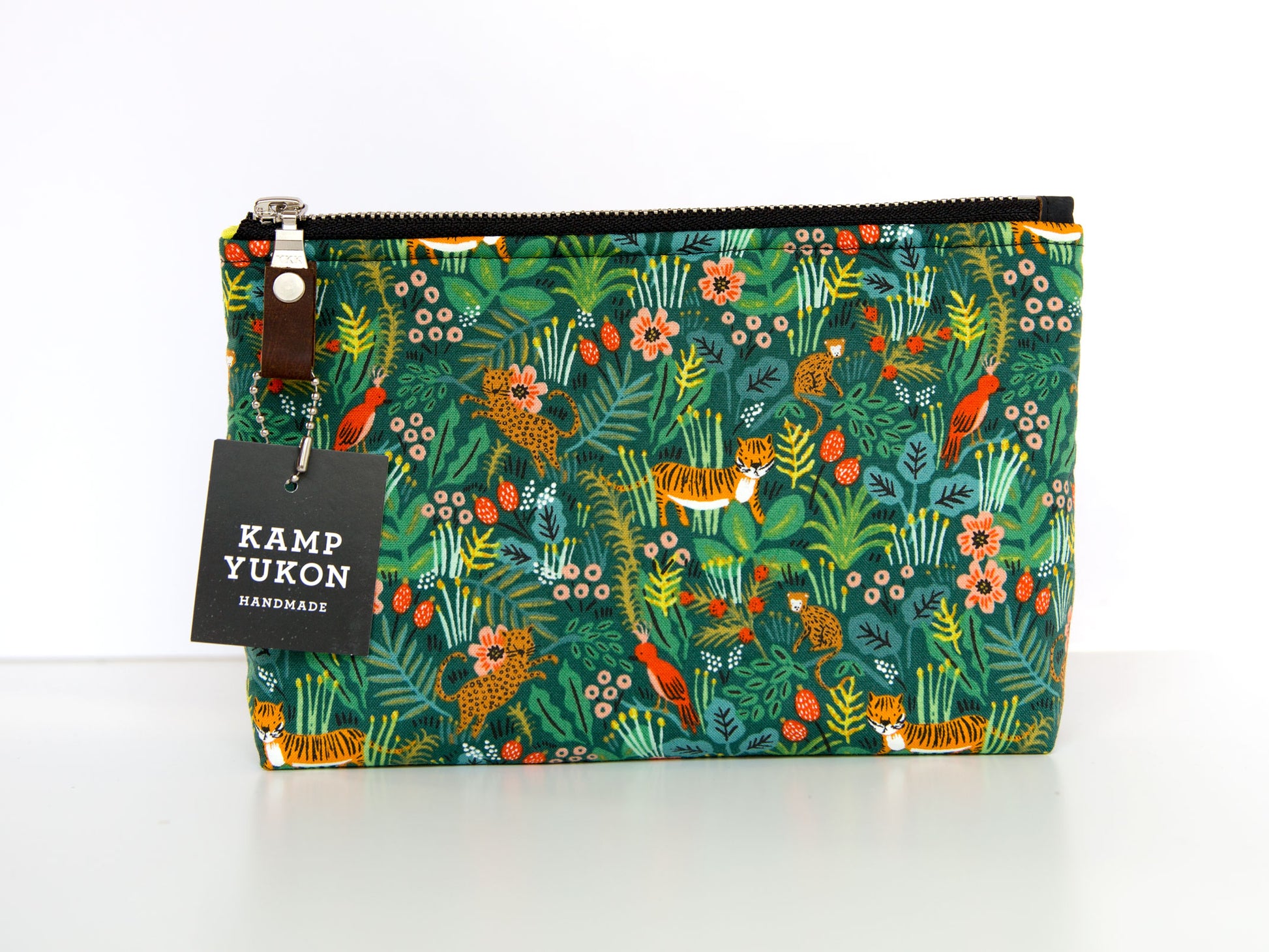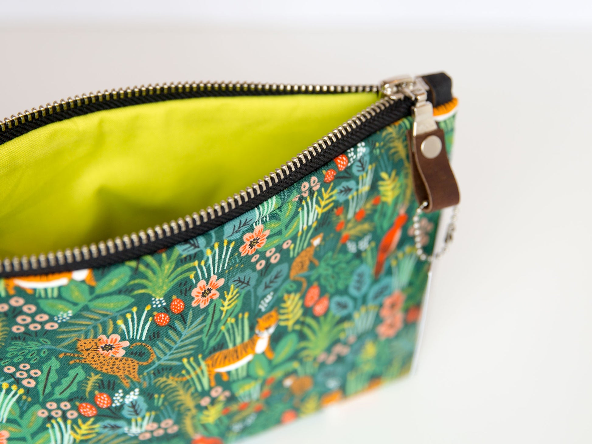With just the right amount of batting and interfacing, this bag is soft and sturdy. Featuring a metal YKK zipper, leather zipper pull, and designer cotton fabric. Made from high-quality materials and built to last.