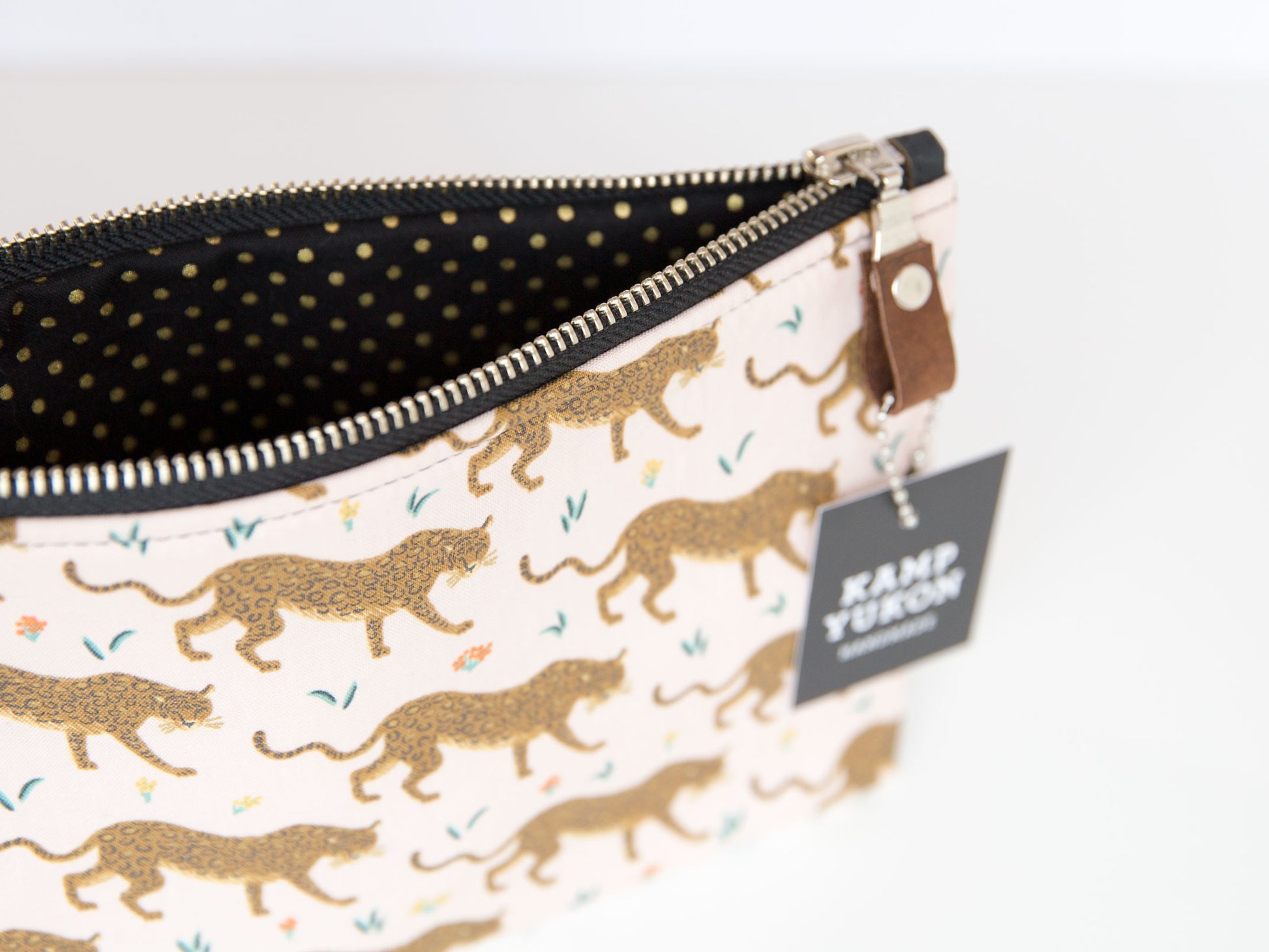 With just the right amount of batting and interfacing, this bag is soft and sturdy. Featuring a metal YKK zipper, leather zipper pull, and designer cotton fabric. Made from high-quality materials and built to last.