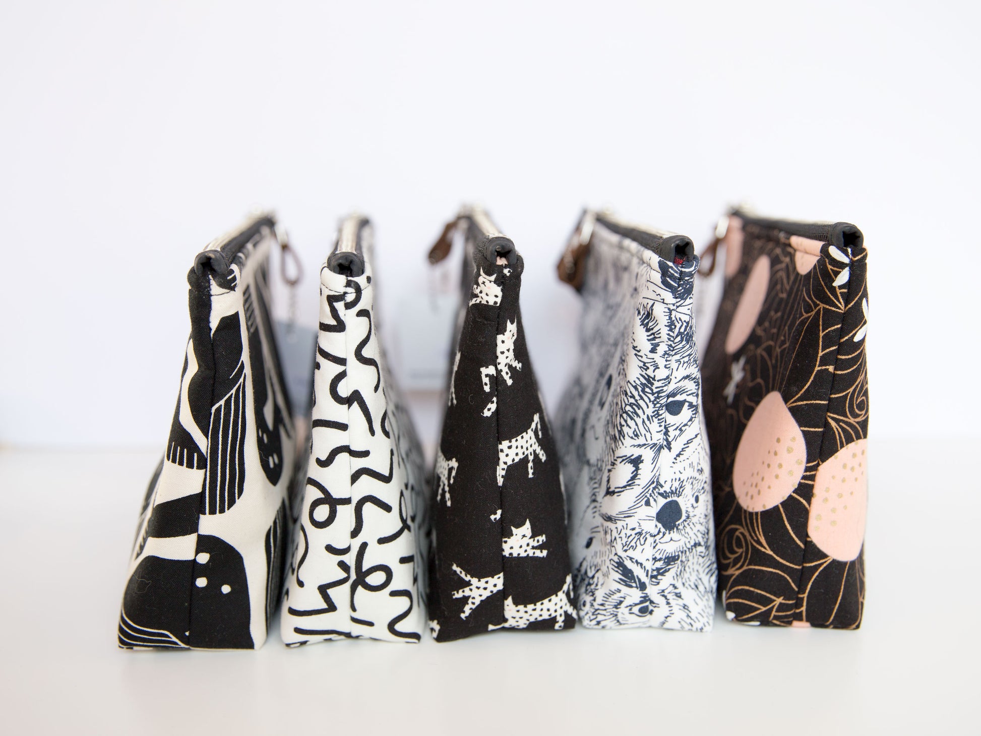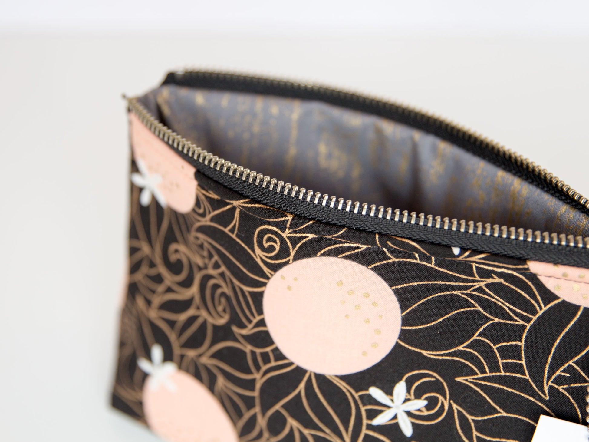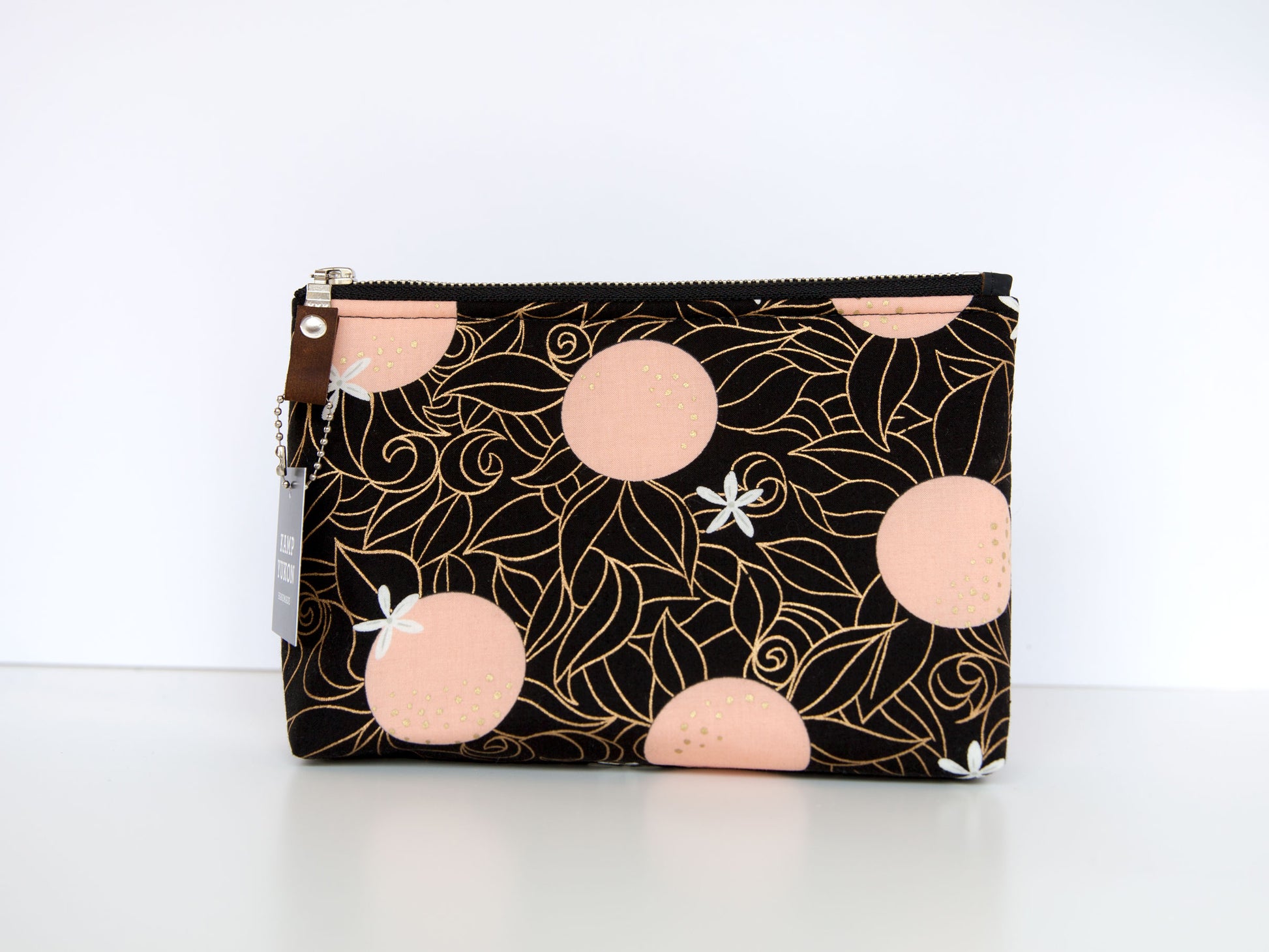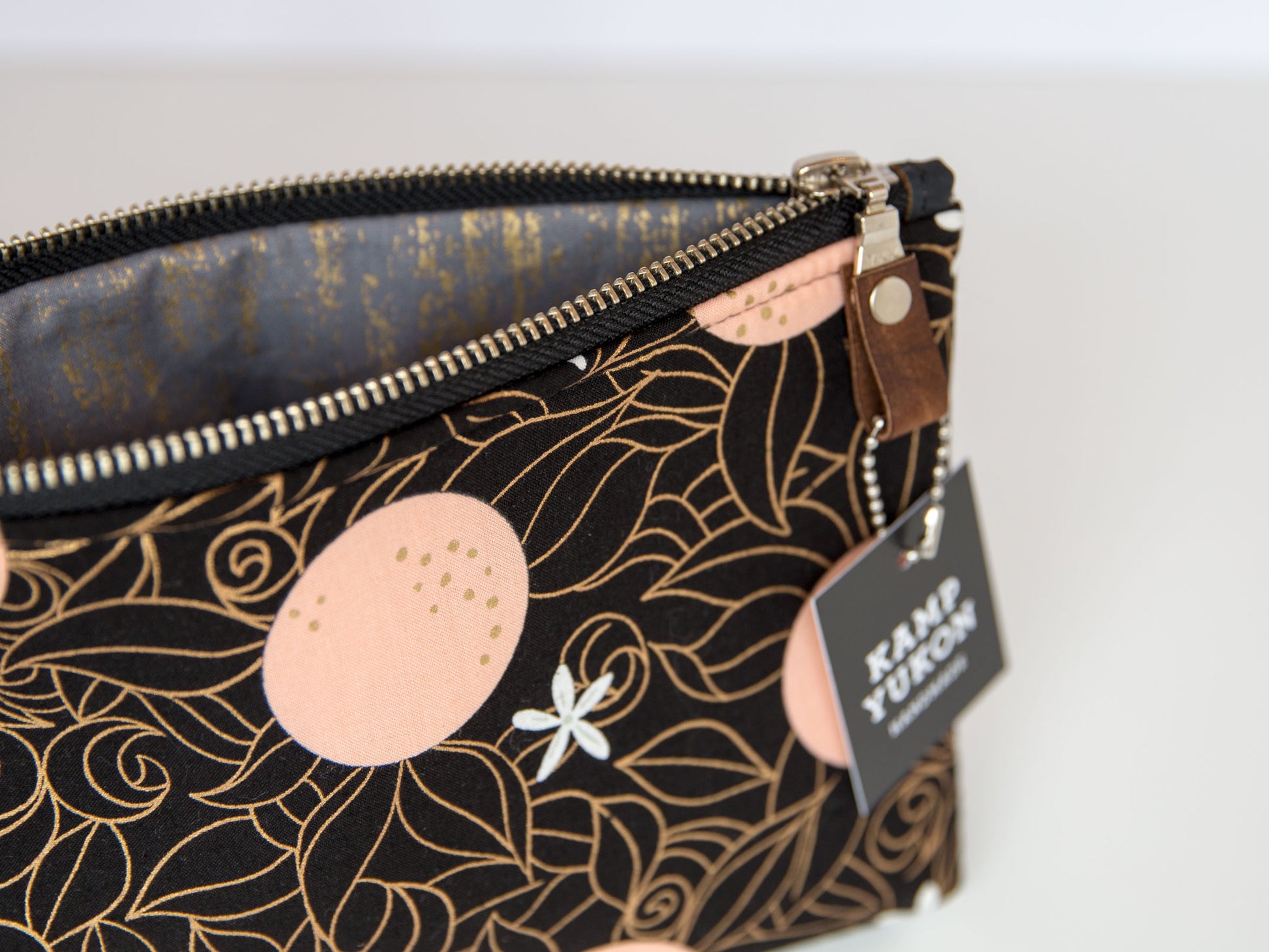 With just the right amount of batting and interfacing, this bag is soft and sturdy. Featuring a metal YKK zipper, leather zipper pull, and designer cotton fabric. Made from high-quality materials and built to last.