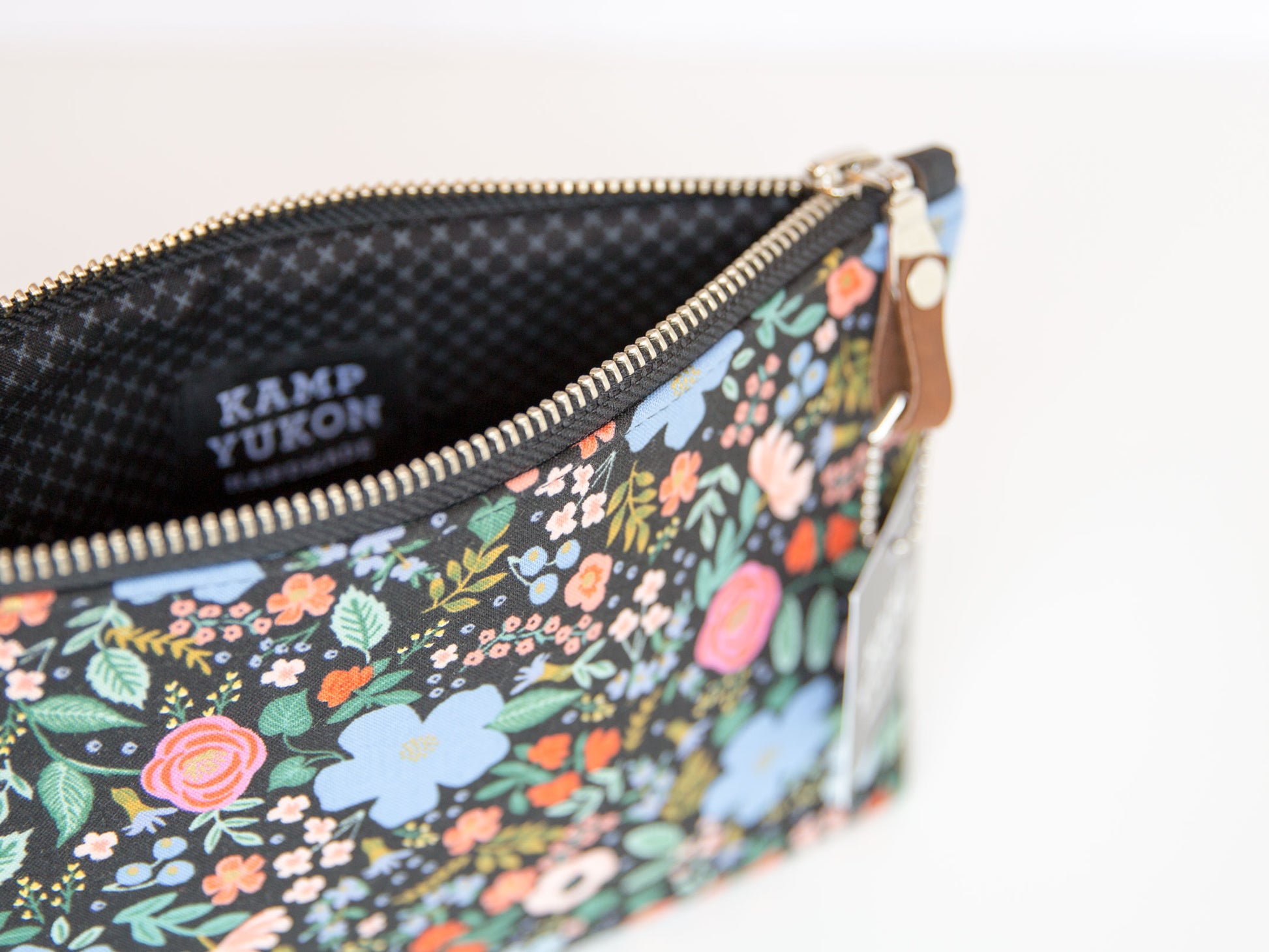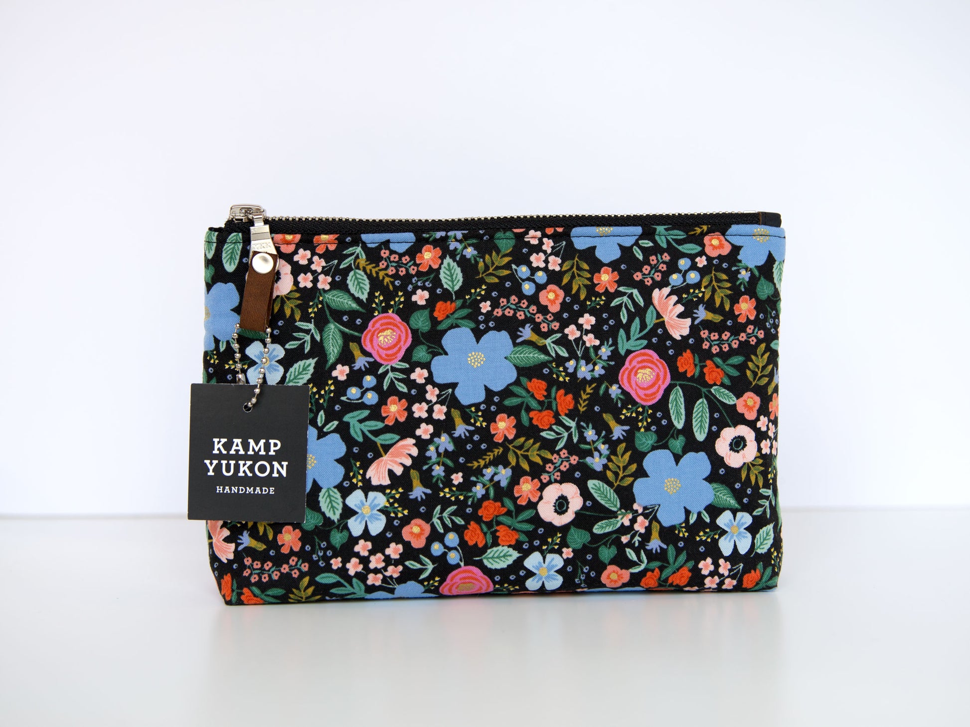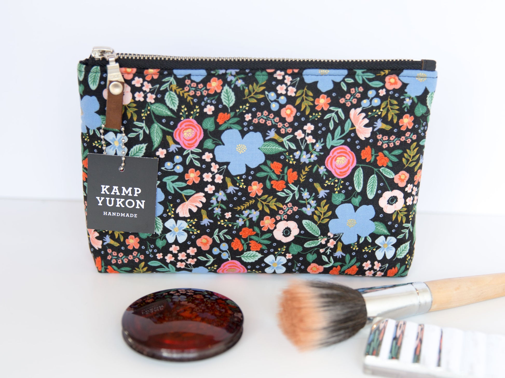 With just the right amount of batting and interfacing, this bag is soft and sturdy. Featuring a metal YKK zipper, leather zipper pull, and designer cotton fabric. Made from high-quality materials and built to last.
